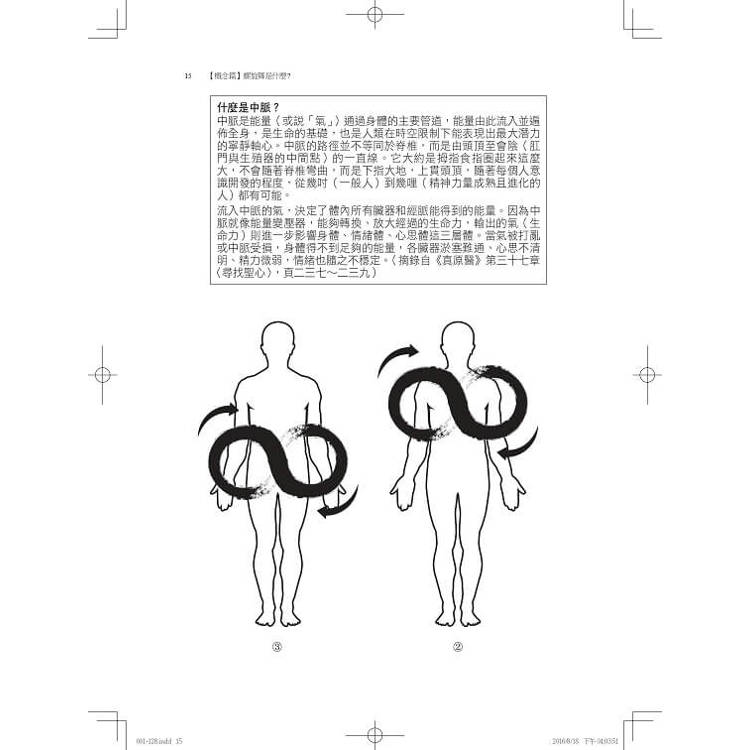 這個原則可說再簡單不過,身體畫一個∞,兩個螺旋自然相對生成,同時不斷的回到中脈。除此以外,沒有什麼系統和規則。