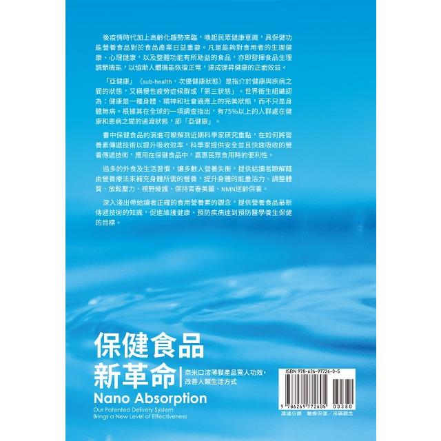 深入淺出帶給讀者正確的食用營養素的觀念,提供營養食品最新傳遞技術的知識,促進維護健康、預防疾病達到預防醫學養生保健的目標。