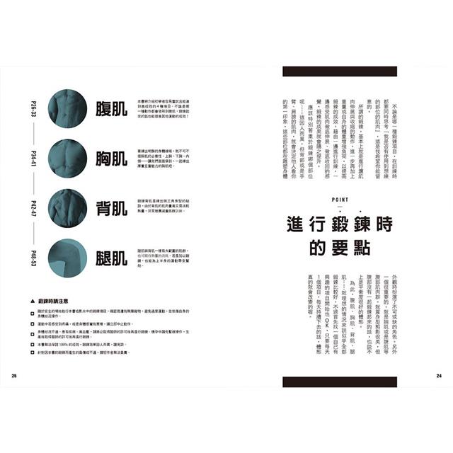 即使方法簡單,也不需要專業的器材和過重的負擔,但依然全方位地針對腹肌、胸肌、背肌、腿肌等鍛鍊身體時著重的四個部位進行多方面的訓練菜單整理。各位可因應自己的需求與當下的身心狀況,從中選擇能配合的內容,每週穩定進行幾個項目與推薦次數即可。