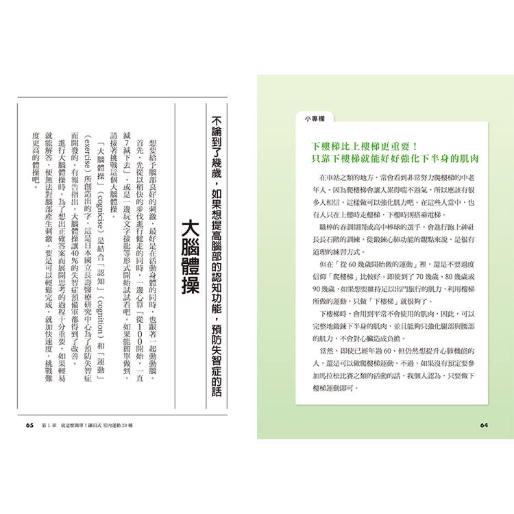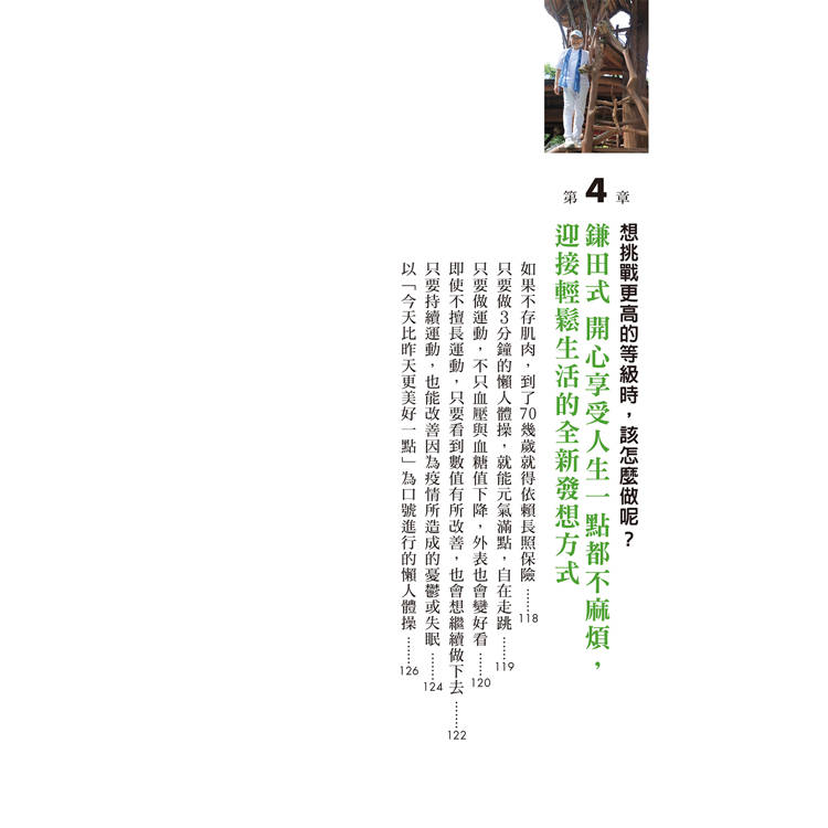 在簡單的運動之外,本書也介紹了難度較高的運動,請各位不要放棄這些運動,試著挑戰看看。我也不是從一開始就全都能完成的。不過,要是能夠成功做到,會讓人很開心。以「更上一層樓」為目標進行挑戰這件事,也和享受人生有所關聯。