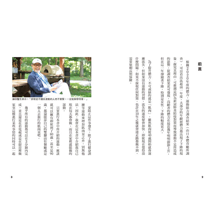 同樣身為銀髮樂活族一員的鎌田實醫師認為,體力與精神的基礎就在「肌肉」。透過他長年協助在地居民建立正確的健康與運動思維所累積的經驗,為自己以及相同年齡層的人們特別設計了容易上手、每天都能輕鬆辦到的「存肌肉」鍛鍊術。希望以此促進高齡長輩們對於運動的興致,並降低他們的不安,將「適當地活動身體」融入日常生活,作為強身健體的紮實基礎。