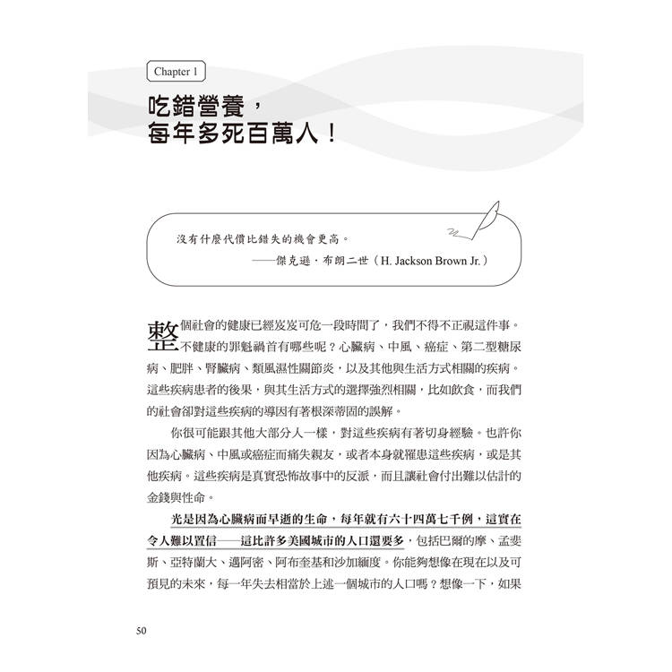 營養能做到的遠比降低風險更多,甚至能夠消除疾病,在許多情況下甚至勝過基因決定論。只要攝取正確的營養,因為不必要的疾病而喪生或早逝的生命,就都有救了。