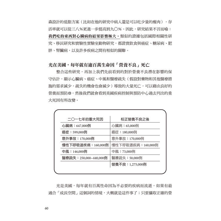 光是美國,每年就有百萬性命因為不必要的疾病而流逝。如果有最適合「成長空間」這個詞的情境,大概就是這件事了;只要攝取正確的營養,因為不必要的疾病而喪生或早逝的生命,就都有救了,而巨大的經濟負擔則可以轉向資助能夠改善社區健康的計畫和政策。