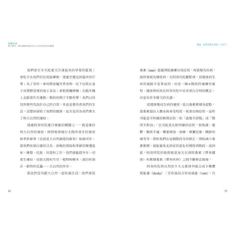 深入解析老化的生理機制,透過阿育吠陀觀點理解人體7大組織的耗損與失衡,從根本改善體質。一套任何人都能實踐的日常練習,專家教你透過日常飲食、作息、呼吸法、冥想與自然連結,排除累積毒素,啟動身體自癒力。