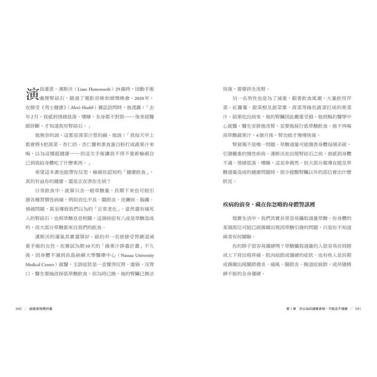 「我永遠不會忘記我21 歲友人每天喝菠菜杏仁奶昔,結果得了腎結石。誰會想到一些所謂的超級食物竟可危害健康?作者結合自身經驗與眾多案例,提出令人信服的證據︰草酸可能是多種神祕健康問題的關鍵致病因素。」