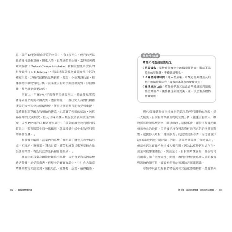 「草酸的特性之一,是容易與食物中的礦物質如鈣、鐵、鋅等結合,形成不易被吸收的草酸鹽,進而降低這些營養素的生物利用率。對於本來就鐵質攝取不足、容易貧血,或微量礦物質吸收效率偏低的人而言,無疑加重了營養缺乏的風險。作者幫助我們重新認識草酸在飲食與健康之間的真實角色」