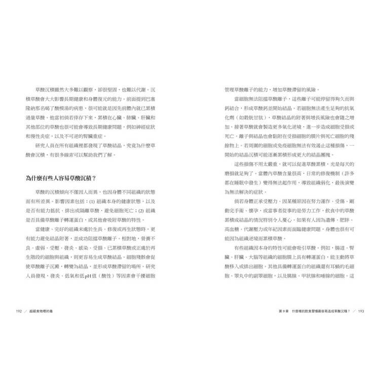 作者不只用科學數據和臨床經驗解釋草酸的影響,還幫助我們辨識高草酸食物、調整烹調與飲食搭配,甚至指出如果懷疑自己有草酸代謝問題,可以透過簡單的檢查找到答案。