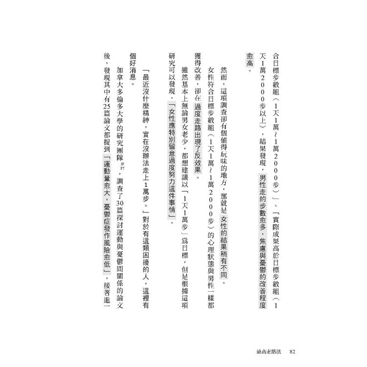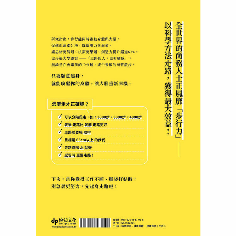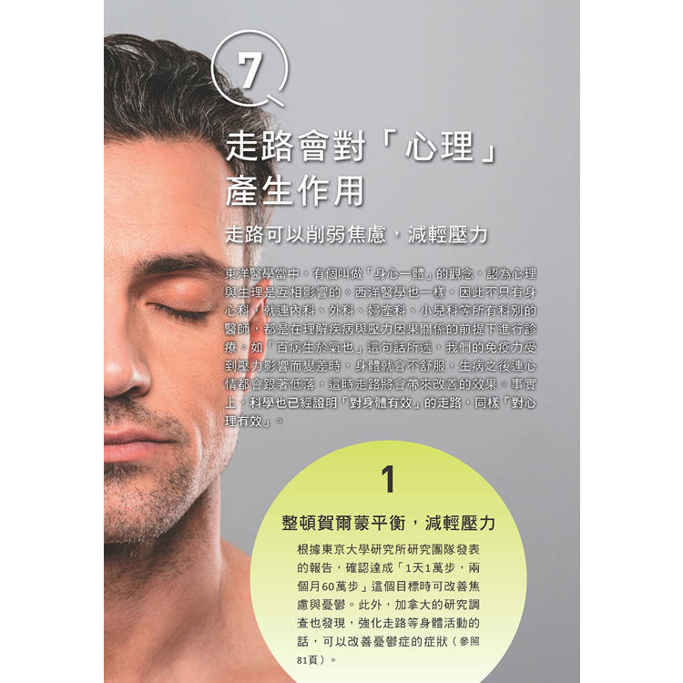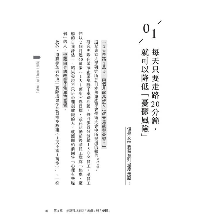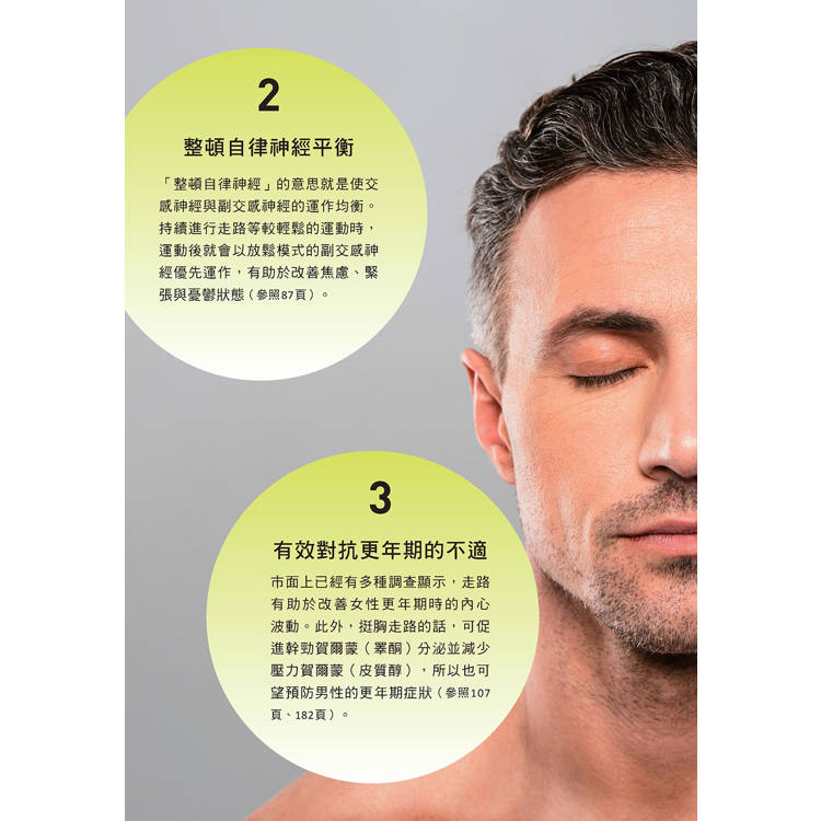 1. 改善壓力與焦慮:書中的研究指出,商務人士僅需四週步行計畫,即可明顯減輕壓力、提升社交應對力。