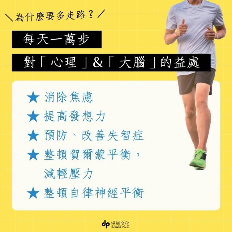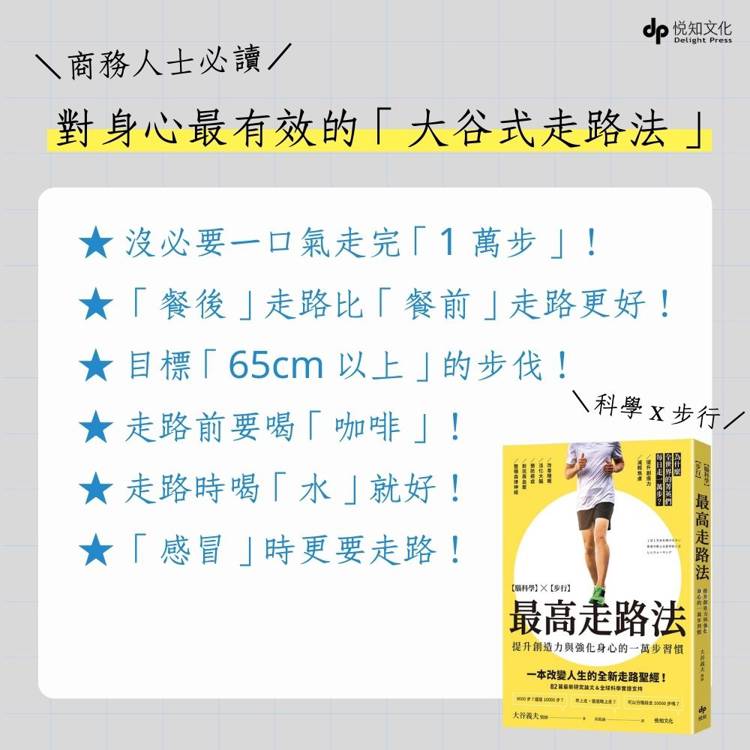 1. 改善壓力與焦慮:書中的研究指出,商務人士僅需四週步行計畫,即可明顯減輕壓力、提升社交應對力。