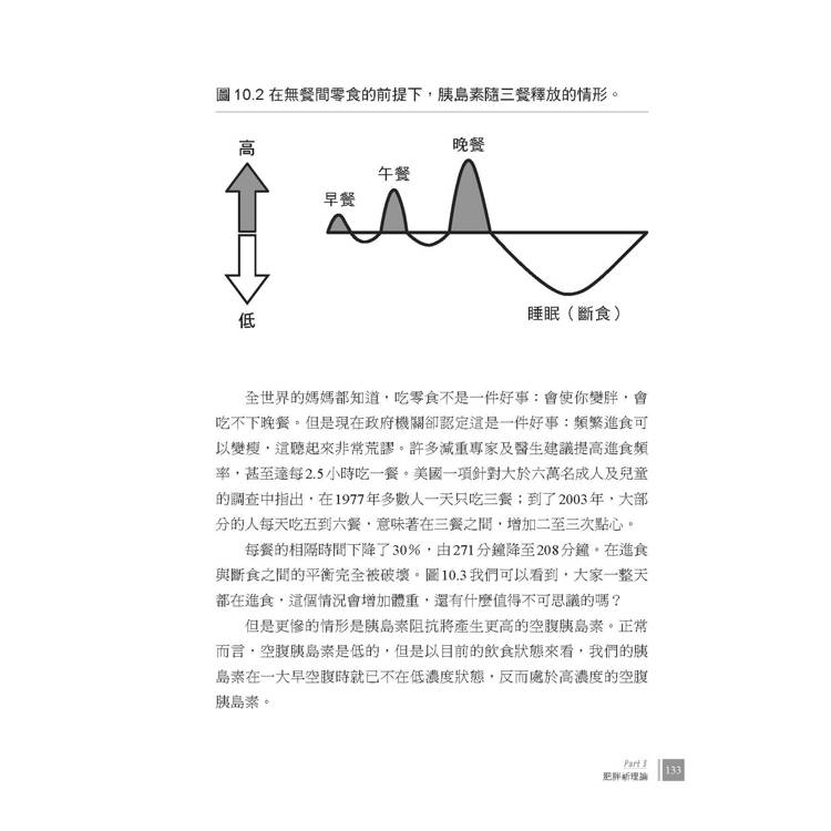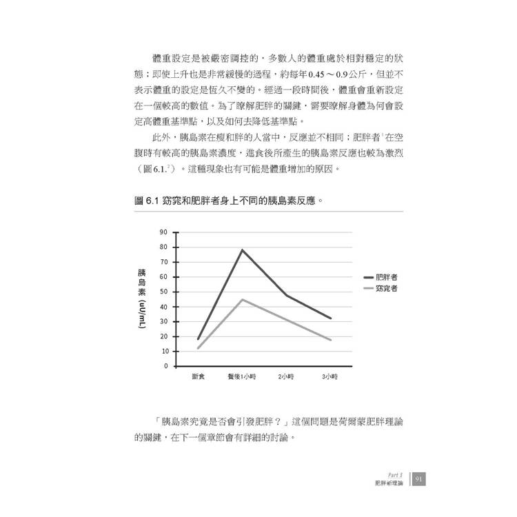 身體的每一個系統都是被調控的。身高由生長激素所調控;血糖由胰島素、升糖激素及其他因素所調控;性成熟由睪固酮及雌性激素調控;體溫由促甲狀腺激素及甲狀腺素調控⋯⋯我們卻被要求相信,體脂肪的增加是不受控制的—一旦進食,體脂肪就會完全不受荷爾蒙所掌控地上升。而過多的卡路里將被倒進脂肪細胞中。