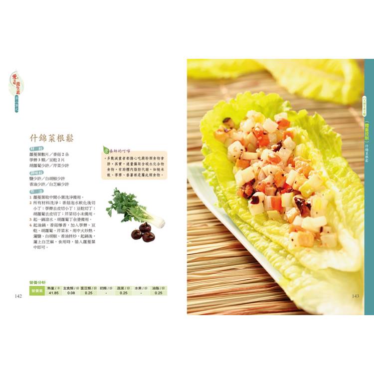 本書從專業營養的角度出發,破除坊間對於「吃素」的迷思,並依中醫食療的理論分成12大類養生主題,以簡單易學的食譜,讓讀者在家也能輕鬆做出養生素食。本書亦融合食物份量的概念,讓不同年齡層、不同營養需求的人,可以從食譜中選擇適合自己的美味養生素。