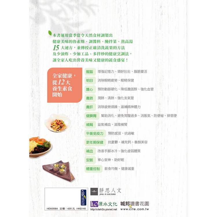 依據12大健康主題(如醒腦、護心、補腎、安眠、體重控制等),量身設計70道素食料理,每一道都對應具體身體狀況,吃得有感、吃得有效。
