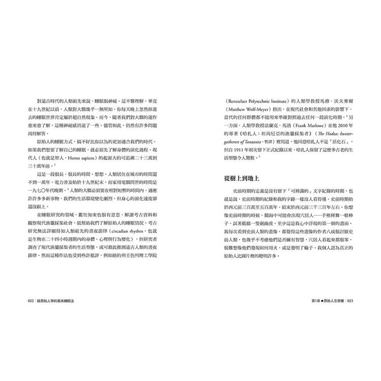 本書先從人類遠古祖先們的生活與睡眠習慣談起,相當有趣。例如原始人食用蛋白質較多、含糖量較少,這樣的飲食習慣對於提升睡眠品質很有幫助;我們睡眠中若身體失去平衡,可能會突然出現墜落感,是因為原始人也睡在樹上,需要能及時清醒來維持安全狀態;穴居人也有床,而且有驅蟲的設計與巧思;古代人也有釀酒,甚至使用某些天然迷幻藥物的跡象(而且不利於睡眠品質)。這些冷知識不僅有趣,更能幫助我們理解現代人的很多習慣,都是經過百萬年演化而來的,卻依然深深影響著我們現代人。