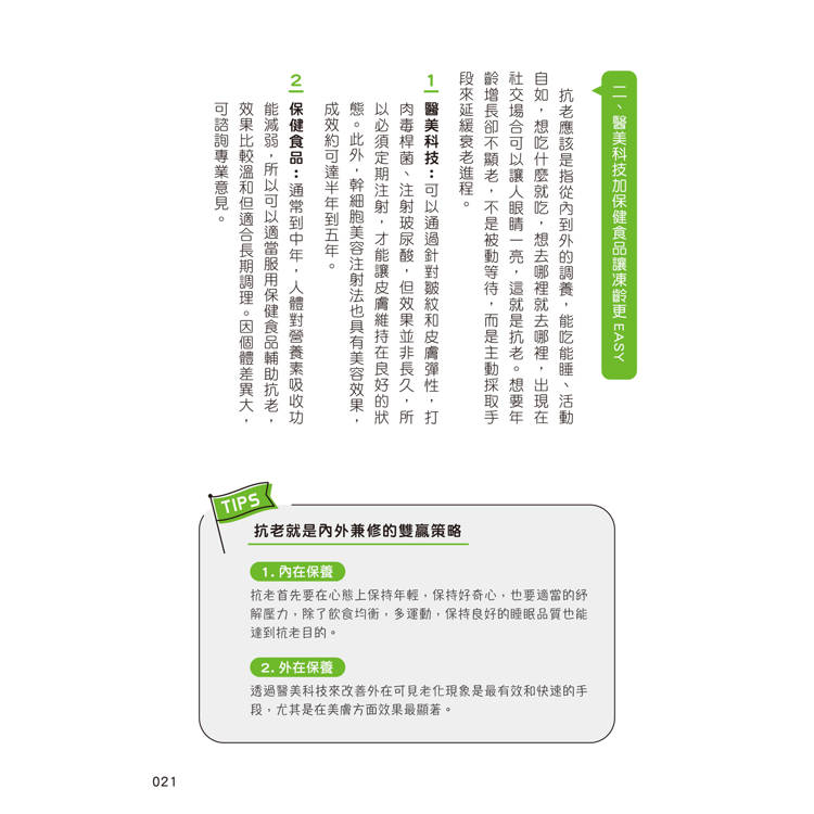 當你透過本書,從今天開始理解老化,並正確地飲食、運動,做好睡眠、情緒管理,選對保健食品與醫美,便能讓身體更加健康與年輕。