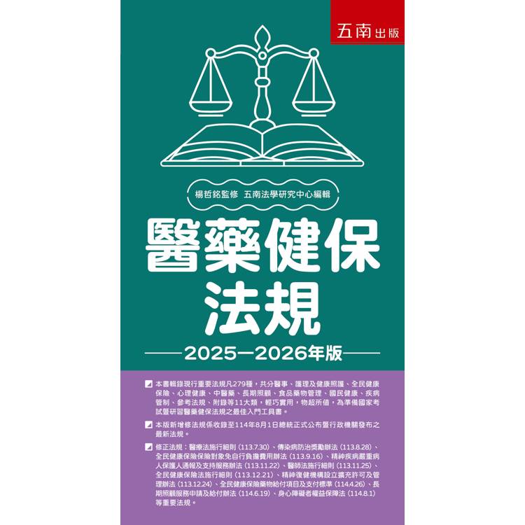 ◎本書輯錄現行重要法規凡279種,共分醫事、護理及健康照護、全民健康保險、心理健康、中醫藥、長期照顧、食品藥物管理、國民健康、疾病管制、參考法規、附錄等11大類,輕巧實用,物超所值,為準備國家考試暨研習醫藥健保法規之最佳入門工具書。