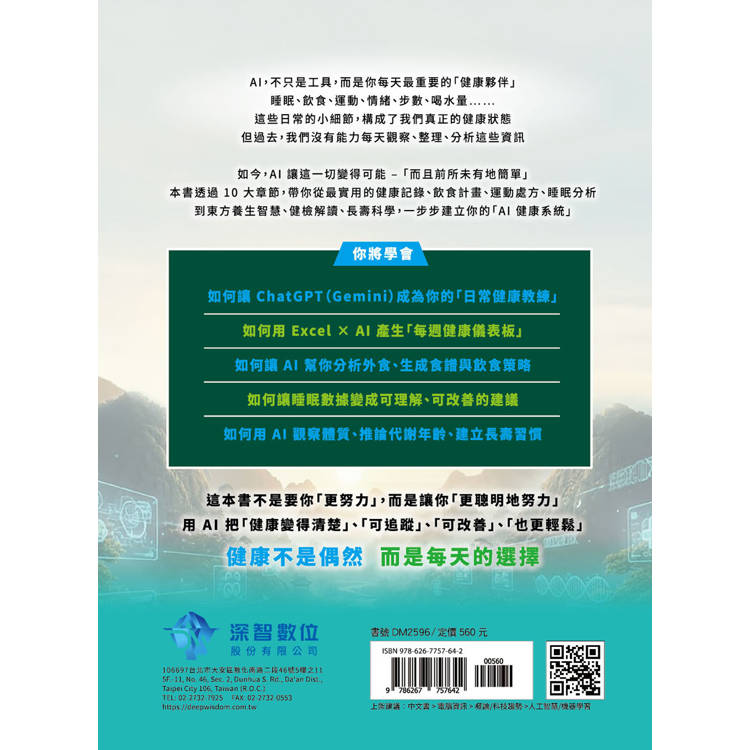 從第一章到第十章,本書以循序漸進的方式,幫助你完成一場「AI 與健康的整合之旅」。這不是艱澀的醫療教材,也不是抽象的養生哲學,而是一本讓人可以每天實作、每天改善、每天更懂自己的健康行為指南。當 AI 能夠理解你的生活軌跡,你也將從 AI 的分析中,看見一個更清楚、更可調整的自己。