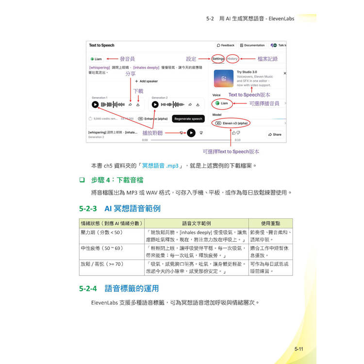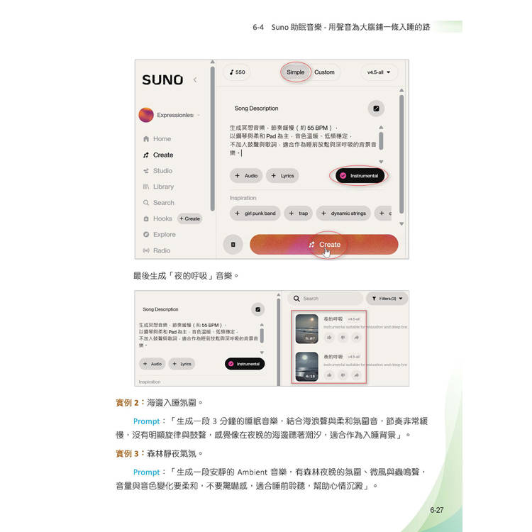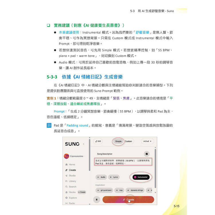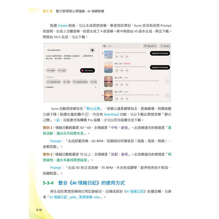 ◎照顧心情與睡眠:從 AI 情緒日記,到冥想語音、助眠故事、Suno 睡眠音樂,本書示範如何用科技輔助放鬆與心靈平衡。