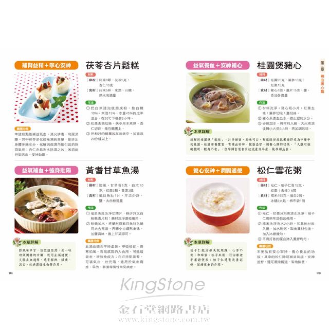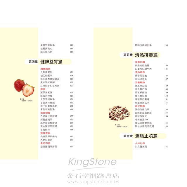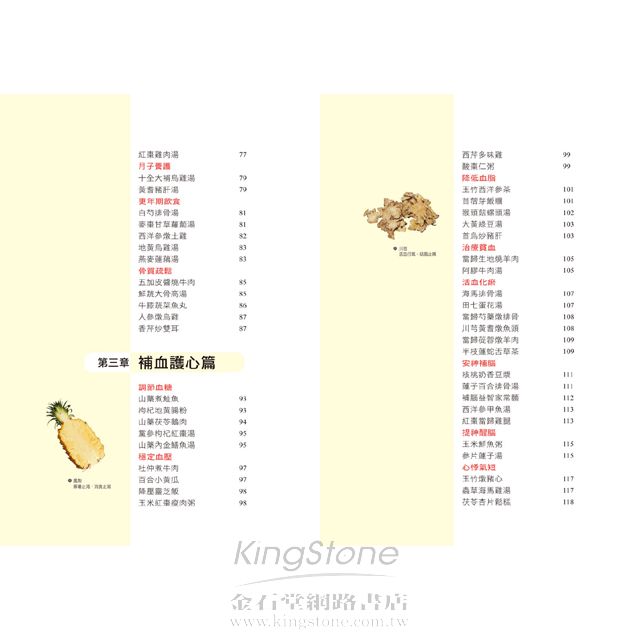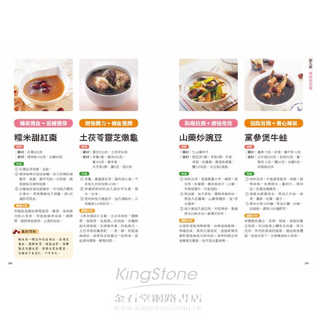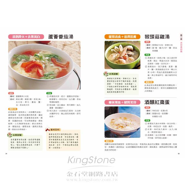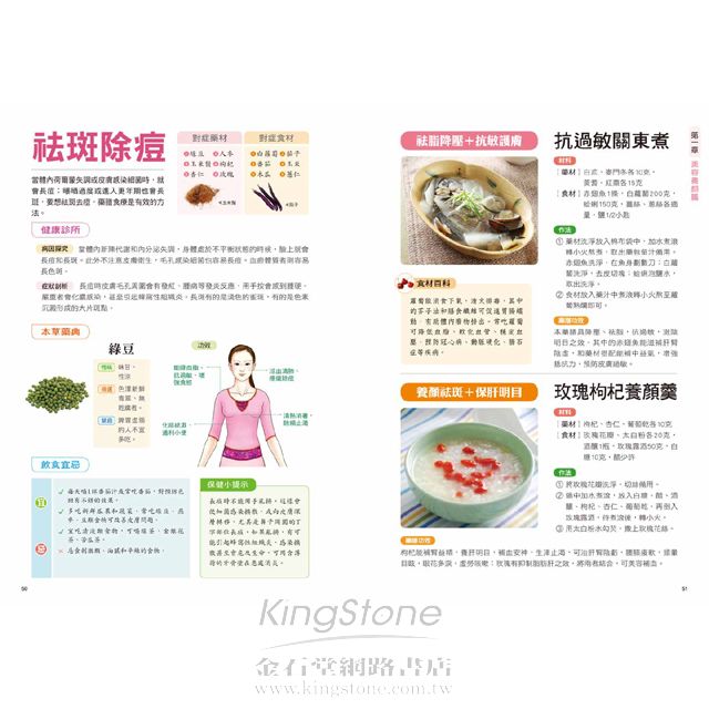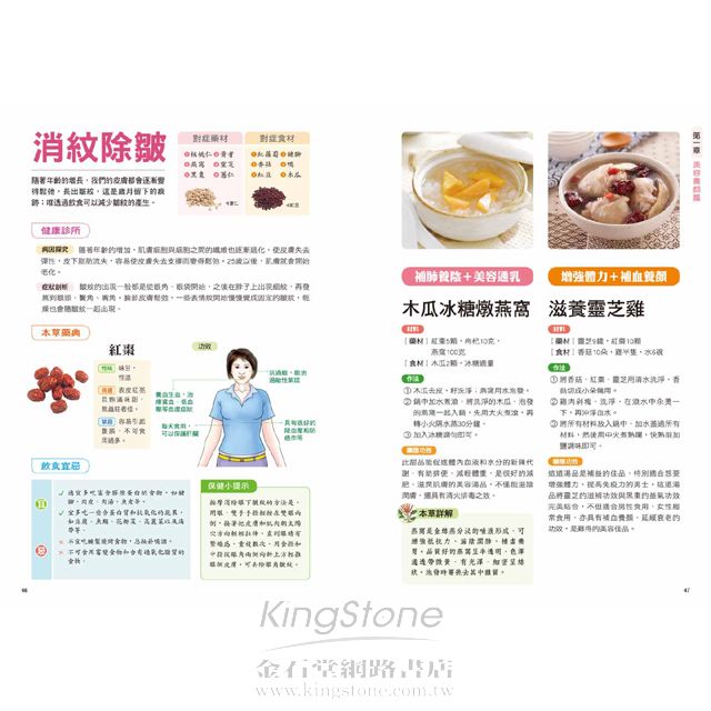 第一章 美容養顏篇消紋除皺隨著年齡的增長,我們的皮膚都會逐漸變得鬆弛,長出皺紋,這是歲月留下的痕跡;透過飲食可以減少皺紋的產生。 對症藥材:核桃仁、黃耆、燕窩、靈芝、黑棗、薏仁對症食材:紅蘿蔔、豬腳、香菇、鴨、紅豆、木瓜健康診所病因探究隨著年齡的增加,肌膚細胞與細胞之間的纖維也逐漸退化,使皮膚失去彈性,皮下脂肪流失,容易使皮膚失去支撐而變得鬆馳。25歲以後,肌膚就會開始老化。症狀剖析皺紋的出現一般都是從眼角、眼袋開始,之後在脖子上出現細紋,再發展到額頭、鬢角、嘴角。臉部皮膚鬆弛,一些表情紋開始慢慢變成固定的皺紋,乾燥也會隨皺紋一起出現。本草藥典─紅棗性味:味甘,性溫挑選:表皮紅亮且飽滿味甜,無蟲蛀者佳。禁忌:容易引起腹脹,不可食用過多。功效:1 養血生血,治療貧血、低血壓等血虛症狀。2 每天食用,可以保護肝臟。3 抗過敏,能治過敏性紫斑。4 具有很好的降血壓和防癌作用。 飲食宜忌宜1 適宜多吃富含膠原蛋白的食物,如豬腳、肉皮、肉湯、魚皮等。2 宜吃一些含蛋白質和抗氧化的蔬果,如豆腐、魚類、花椰菜、高麗菜以及海帶等。忌1 不宜吃醃製燒烤食物,忌抽菸喝酒。2 不可食用霉變食物和含有過氧化脂質的食物。保健小提示按摩消除眼下皺紋的方法是,閉眼,雙手手指輕按在雙眼兩側,接著把皮膚和肌肉朝太陽穴方向輕輕拉伸,直到眼睛有緊繃感,重複數次。用食指和中指從眼角兩側向斜上方輕推眼側皮膚,可去除眼角皺紋。對症藥膳木瓜冰糖燉燕窩補肺養陰+美容通乳材料【藥材】紅棗5顆,枸杞10克,燕窩100克【食材】木瓜2顆,冰糖適量作法1 木瓜去皮、籽洗淨;燕窩用水泡發。2 鍋中水燒滾,將洗淨的木瓜、泡發的燕窩一起入鍋,先用大火煮滾,再轉小火隔水蒸30分鐘。3 加入冰糖調勻即可。藥膳功效此甜品能促進體內血液和水分的新陳代謝,有助排便、減輕體重,是很好的減肥、滋潤肌膚的美容湯品,不僅能滋陰潤膚,還具有清火排毒之效。本草詳解燕窩是金絲燕分泌的唾液形成。可增強抵抗力、滋陰潤肺、補虛養胃。品質好的燕窩呈半透明,色澤通透帶微黃,有光澤,細密呈絲狀。泡發時要挑去其中雜質。滋養靈芝雞提高體力+補血養顏材料【藥材】靈芝9錢,黑棗10顆【食材】香菇10朵,雞半隻,水6碗作法1 將香菇、黑棗、靈芝用清水洗淨,香菇切成小朵備用。2 雞肉剁塊,洗淨,在滾水中汆燙一下,去除血水。3 將所有材料放入鍋中,加水蓋過所有材料,然後用中火煮熟爛,快熟前加鹽調味即可。藥膳功效這道湯品是補益的佳品,特別適合想要增強體力、提高免疫力的男士。這道湯品將靈芝的滋補功效與黑棗的益氣功效完美結合。不但適合男性食用,女性常食亦具有補血養顏、延緩衰老的功效,是難得的美容佳品。保濕潤膚乾燥的空氣和營養缺乏,都會使皮膚乾燥,多吃一些滋陰的食物能夠確保肌膚滋潤,同時保持皮膚彈性。 對症藥材:蘆薈、當歸、玉竹、芍藥、熟地對症食材:番茄、干貝、猴頭菇、豌豆、花椰菜、雞蛋健康診所病因探究皮膚乾燥是指因皮膚缺乏水分而出現不適的現象。年齡增長、氣候變化、睡眠不足、過度疲勞、洗澡水過熱等都可能導致皮膚乾燥。也可能因營養不良、脂肪攝取過少或血虛體質引起。症狀剖析多發生在春、秋風大乾燥時。皮膚表層變得更粗糙,手背、腳跟、腳腕處會乾裂、發癢、起皮屑。臉部起紅斑,並伴隨口、鼻四周脫屑,刺癢難受。本草藥典─蘆薈性味:味苦、性寒挑選:葉子粉綠色,有白色斑點。禁忌:服用蘆薈新鮮葉片要適量。功效:1 促進血液循環、軟化硬化動脈、降低膽固醇含量。2 治療慢性腎炎、膀胱炎、支氣管炎等病症。3 潤膚保濕,有抗衰老作用。4 能緩解神經痛、痛風、肌肉痛等。 飲食宜忌宜1 平時多喝水,補充身體水分,皮膚細胞才不會缺水。2 多吃新鮮蔬菜水果,其中的維生素C能保持肌膚彈性。3 多吃含有膠原蛋白和維生素E的食物,有助受損肌膚的修復再生。忌少吃辛香上火的食物,如辣椒、花椒、胡椒等。保健小提示空氣乾燥時,可以隨身攜帶保濕噴霧,臉部乾燥時使用。每週可以做1次保濕面膜,可以選擇蘆薈、牛奶等自製面膜。避免熬夜,注意休息,也能有效地改善皮膚乾燥。對症藥膳干貝炒綠花椰明目抗癌+潤膚消腫材料【藥材】白果1.5兩【食材】綠花椰菜300克,新鮮干貝6兩,蔥、薑、蒜各少許,鹽、糖、胡椒粉各適量作法1 將綠花椰菜、干貝及白果以水洗淨(不需泡水)。2 先將綠花椰菜入滾水汆燙,再把蔥、薑、蒜片放入油鍋中爆香。3 加入新鮮干貝、白果一起拌炒,待熟後,調味即可。藥膳功效綠花椰菜富含多種維生素、蛋白質及礦物質,有明目、利尿、抗癌的功效;白果能潤澤皮膚、消除水腫,是一道美顏佳品;因此,兩者的結合,對改善因疲勞而造成的膚質黯淡無光澤、調節視力等都有幫助,適合愛美的人食用。洛神水果沙拉強精補腎+養血美容材料【藥材】洛神花10克【食材】蝦仁、透抽、奇異果各70克,蟹肉棒15克,洋香瓜80克,優酪1大匙,沙拉醬2/3大匙作法1 洛神花洗淨,加水一起熬煮至水剩下約50c.c.時,熄火放涼,取20c.c.湯汁和調味料拌勻成調味醬。2 將海鮮類洗淨,切塊,分別汆燙。3 奇異果、洋香瓜分別去皮後切丁,和作法.一起盛盤,淋上調味醬即可。藥膳功效水果富含維生素C、A以及礦物質,還有大量的水分和膳食纖維,可促進健康。其中的維