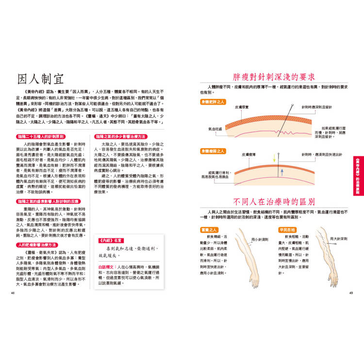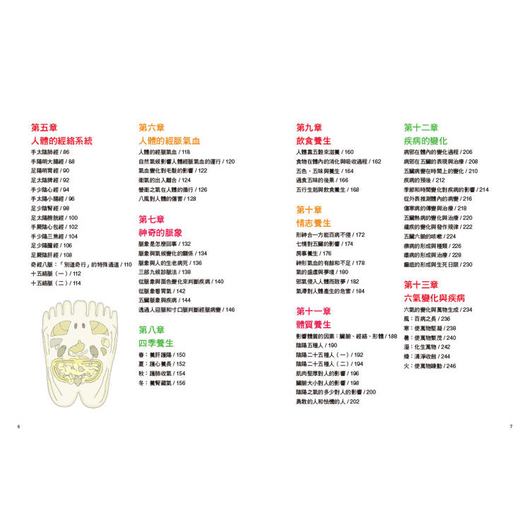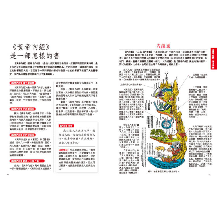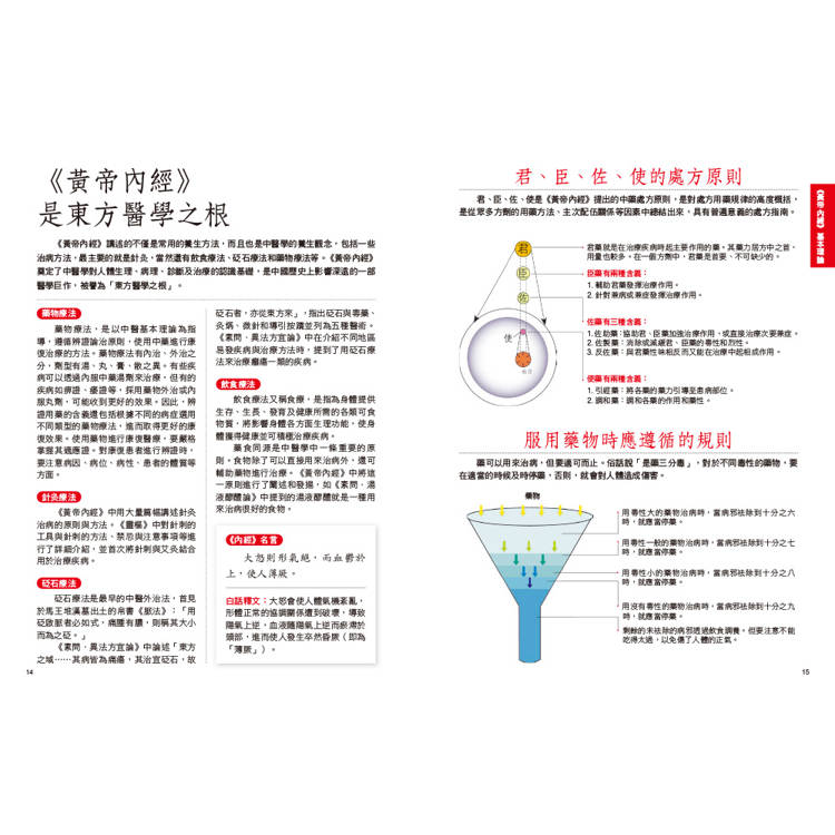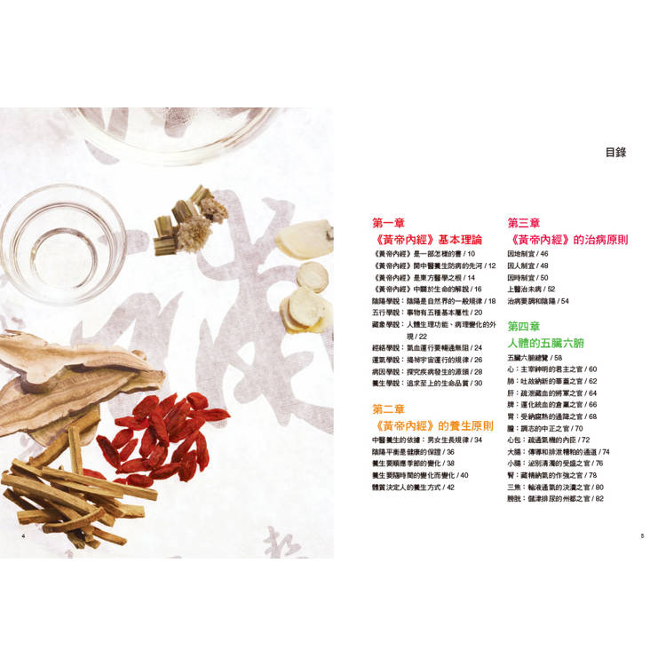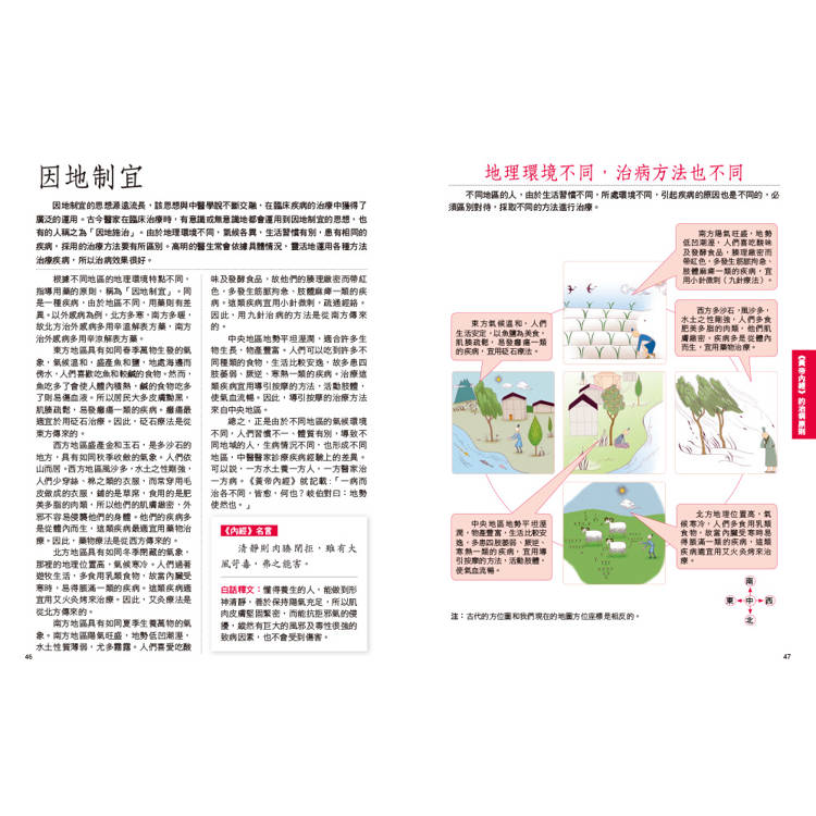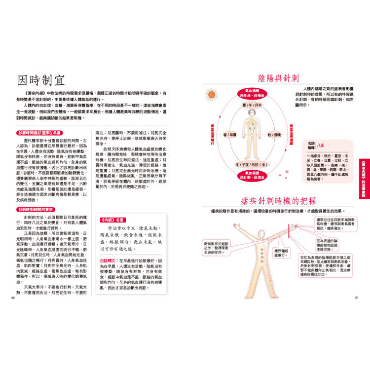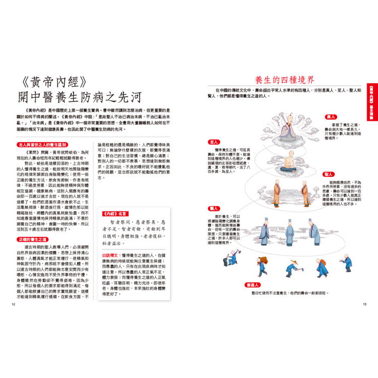 內容不僅說明《黃帝內經》的基本養生,還搭配生活中實際的日常保健觀念,如「養生原則」、「治病原則」,以直觀的方式表達,讓讀者一讀就懂。