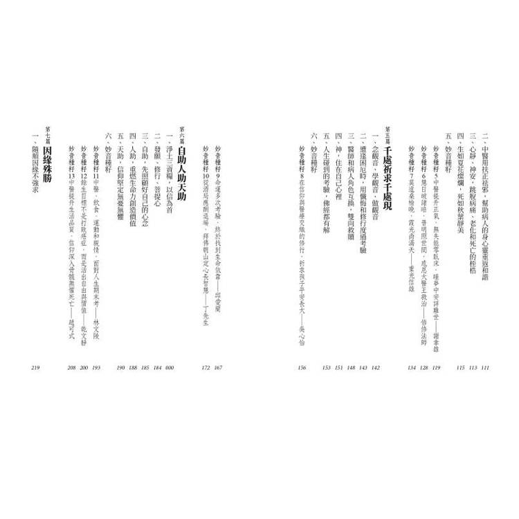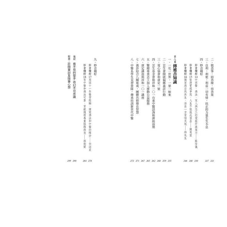 書中共有十八位妙音種籽故事,在不同章節呈現,前十六位是跟我有緣的患者分享自身罹病體驗感受,當中有六十年跨世代的照護故事,有二十年全家兩代真情流露,有跨國越洋醫療照護,也有因緣殊勝巧妙醫療服務;最後一章記錄了傳遞善知識的兩位妙音天使小何及俐蘭的故事,她們兩位代表著多年來,自己有幸遇見的無名志工天使們,就如同千手千眼觀世音般無私奉獻守護大家的健康,令人感佩。