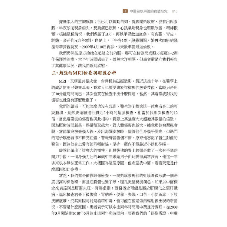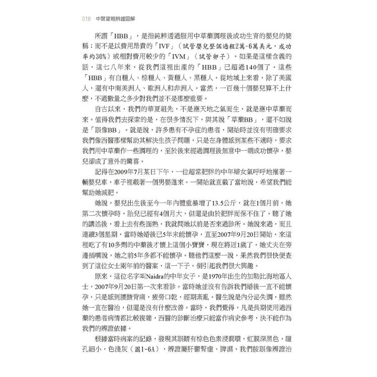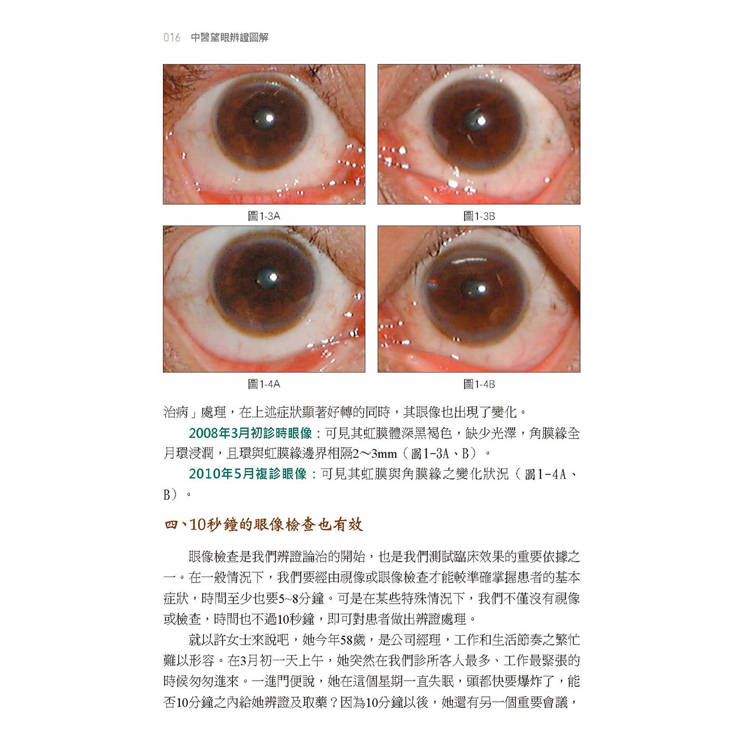 從寫作安排上來看,本書從歷年所收集到10萬多幅具有不同特徵的眼像中,精選出將近800張作圖譜及病例,每張都不重複;病例也選出100多個最有代表性,最新的供參考。其中尤以對人類健康危害最大、最普遍的心腦血管病方面病例最為豐富。為了讓讀者對某些病例有更深入的理解,我們還在一些病例中用「病例特寫」,致內容更詳盡、有趣。但為了節省文字,每例的治療方藥除少數外,大多數都僅按傳統中醫方藥列出名稱而已,請讀者自行查閱。讀者如有需要,可透過網站與我們聯繫:www.eyetells.com,作者的微信號:eye-tells。
