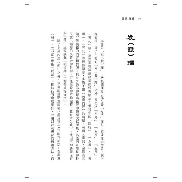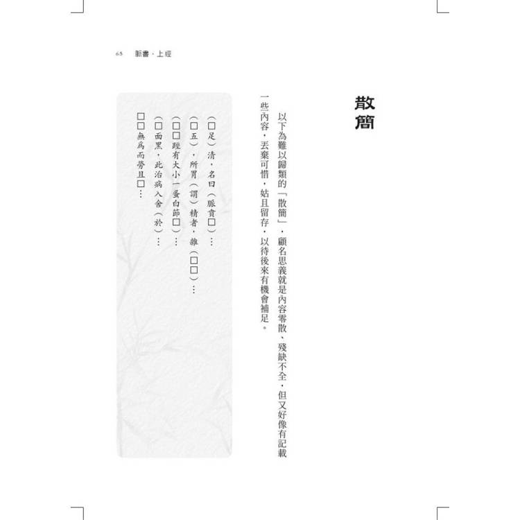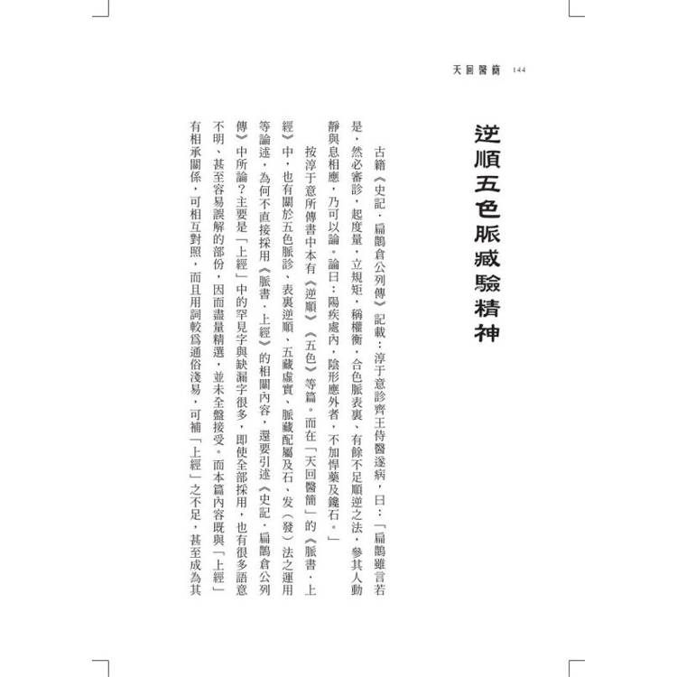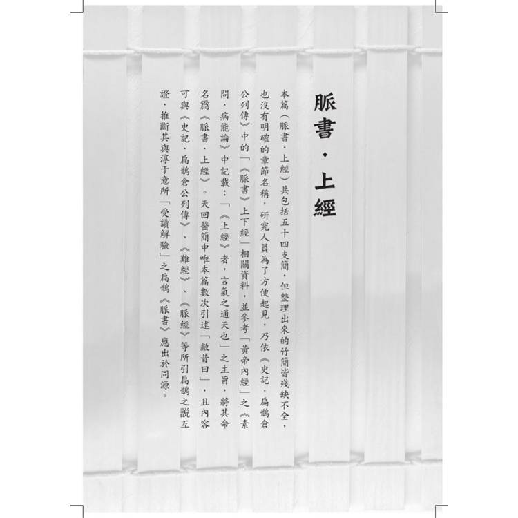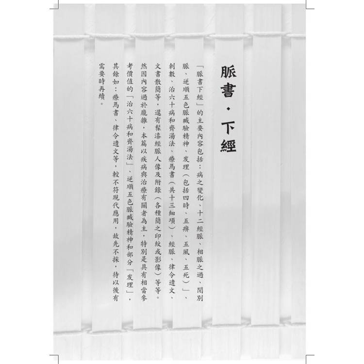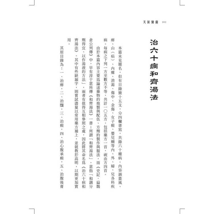 天回醫簡的包含範圍極廣,其中一大部分為脈學。考量到與五十二病方內容的一貫性,以及讀者的實用性,加上研究者的可參考性,本書以〈治 六 十 病和 齊 湯 法〉(簡 稱 和齊湯法)為主體,力求完整;另取〈逆 順 五 色脈 臧 驗 精 神〉做 輔 助 說 明。