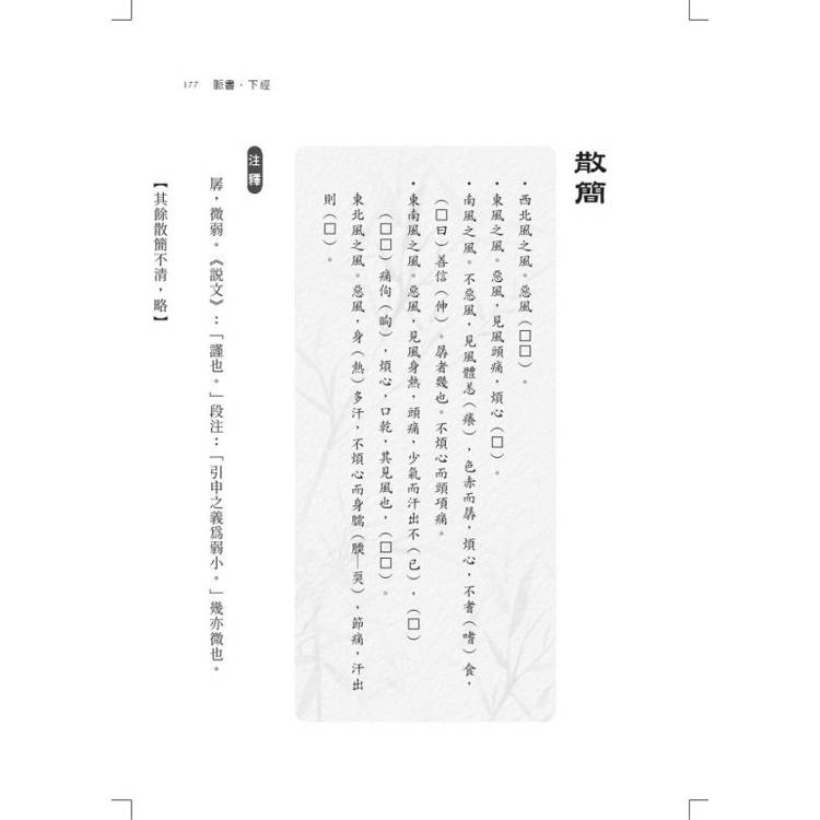 本書挑選最獨特且具實用性者重新解讀,較常見的經脈、「刺術」,及「发理」以下的四時、五痺、五風、五死等均先略過。與人之保健養生或醫藥無關之「療馬書」、「律令遺文」等則不取,待以後機緣成熟再考慮出版續集。