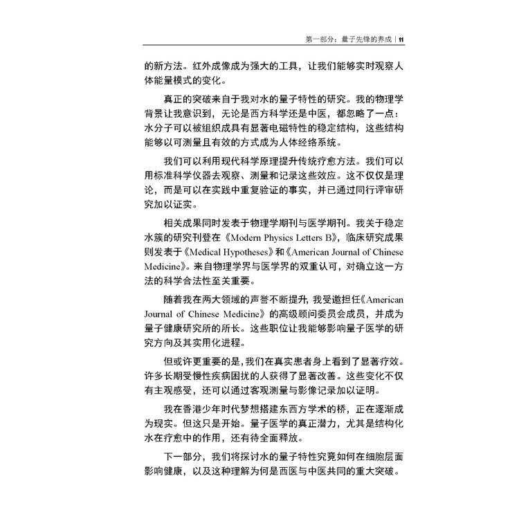 作者經多年探索後,在「水」中找到了答案——量子尺度下的結構化水簇能形成穩定電磁場,可與人體經絡發生可測、可重複的交互作用。紅外成像顯示,它能疏通經絡阻滯,恢復能量流動,且效果可驗證、可測量。這不僅是技術的創新,更是量子物理與中醫理論間實質橋樑的建立。而人體是數萬億細胞協同運作的能量網路。量子醫學不與之對抗,而是順應並增強其內在自愈潛能;通過結構化水技術,我們在量子層面溝通能量與物質,以科學語言詮釋古老智慧,用可重複證據支援整體療愈。