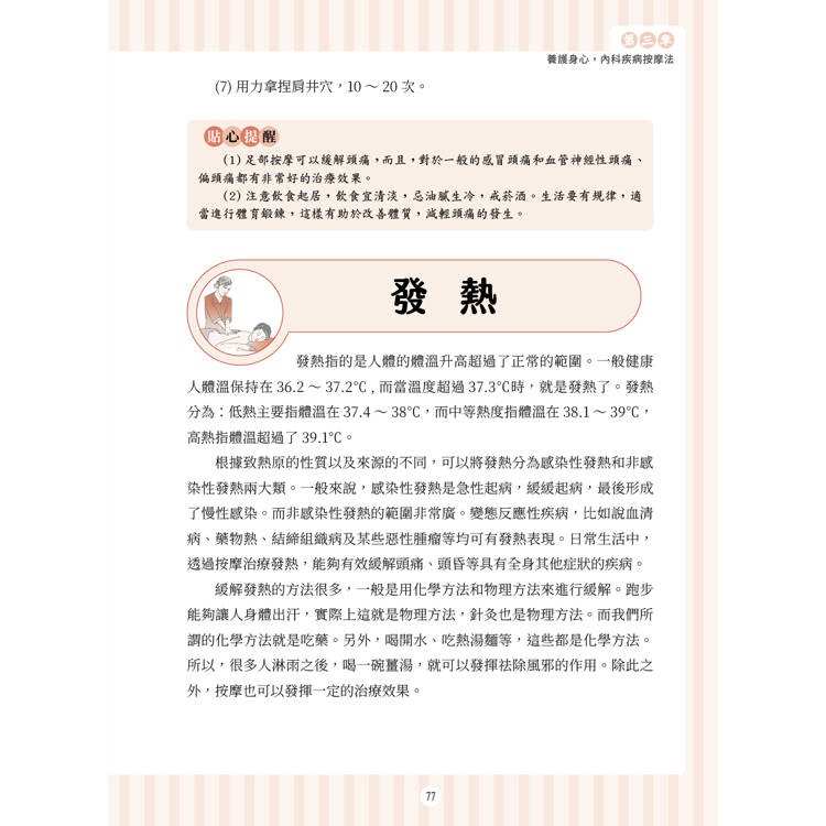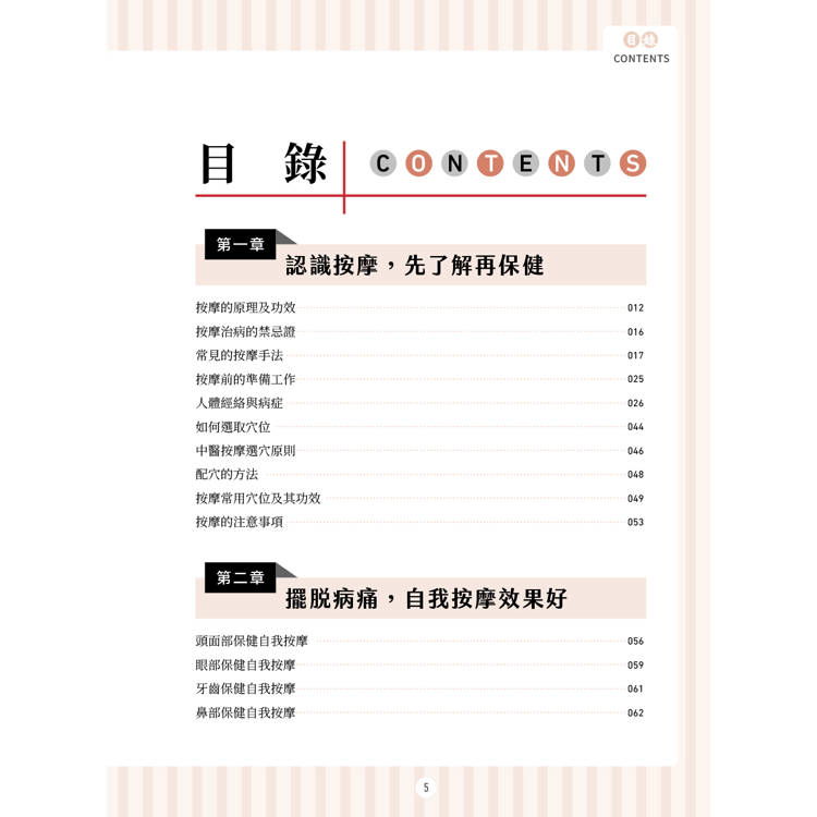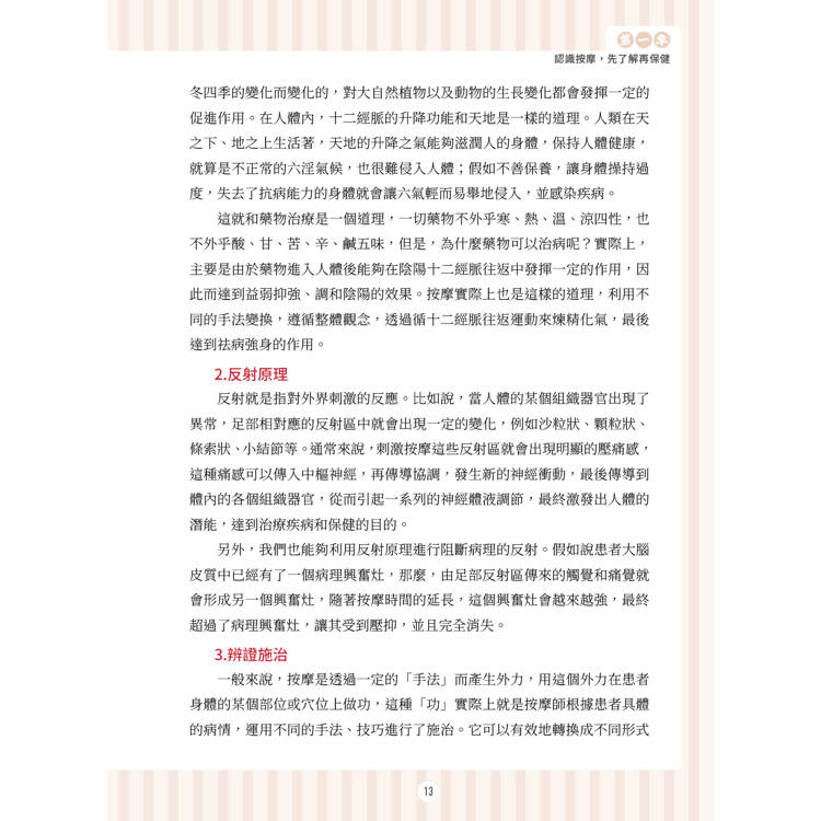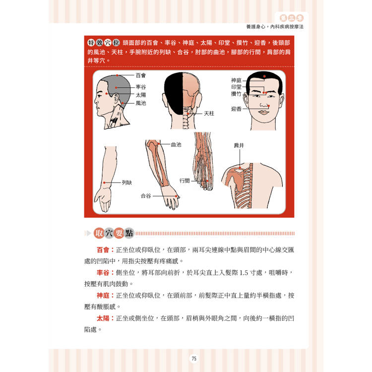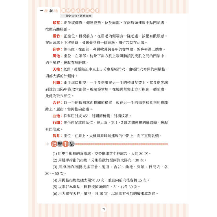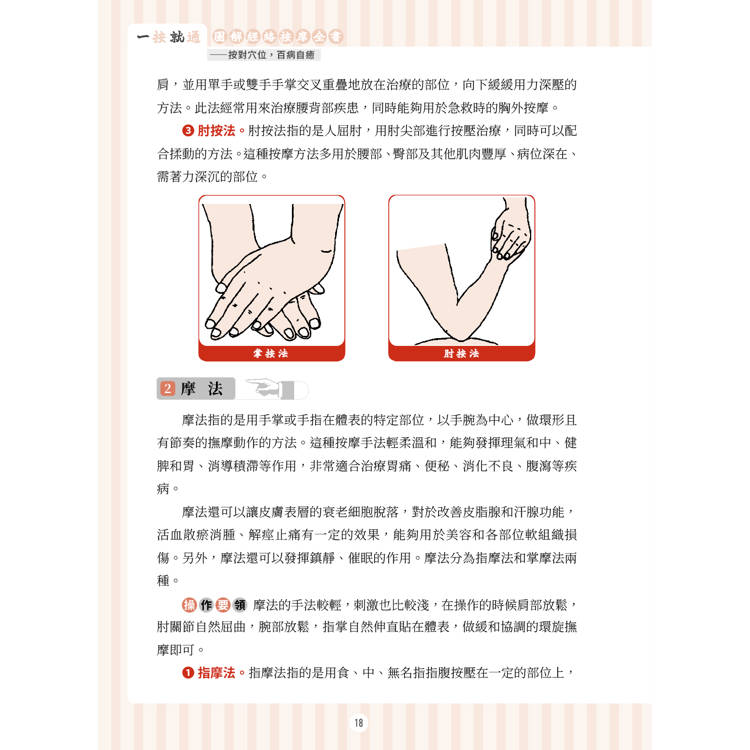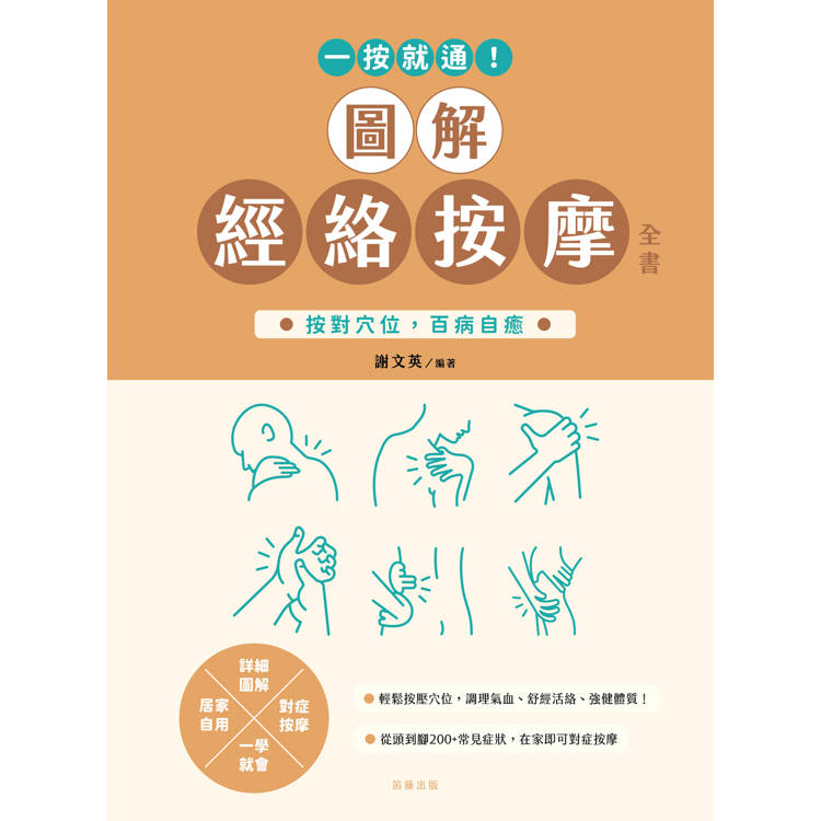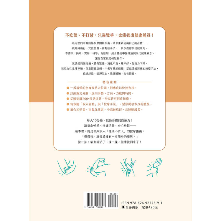 書中配有大量清晰圖示,完整標示經絡走向與穴位位置,搭配按、揉、推、拿、摩、搓、捏、抖等手法教學,即使沒有基礎,也能快速上手。
