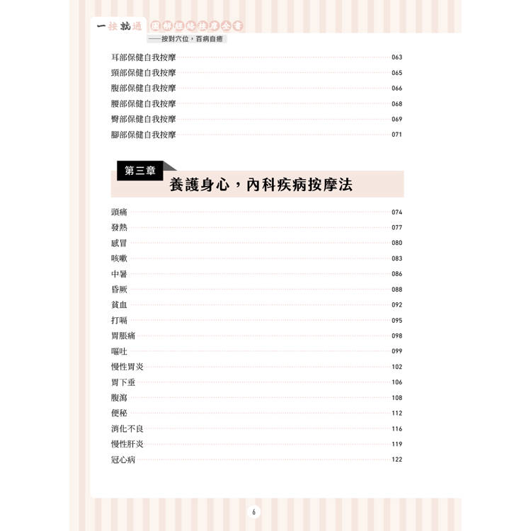 本書以深入淺出的方式,完整解析經絡運行原理與按摩功效,結合臨床實用經驗,將常見病症的對應穴位與操作手法 圖解說明。從基礎理論到實際操作,一看就懂,一學就會,真正做到「按對穴位,百病自癒」。