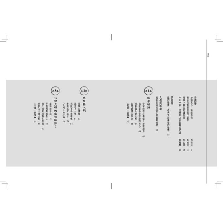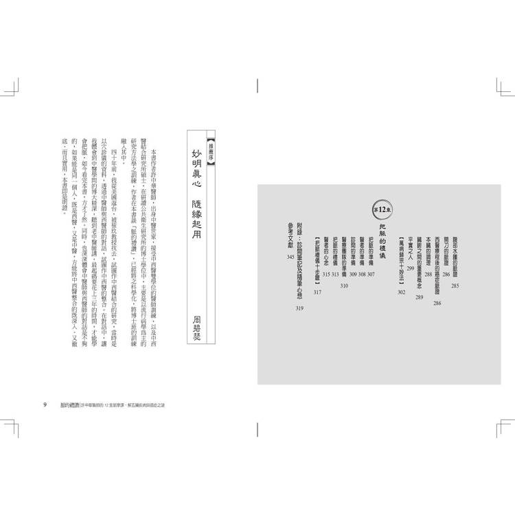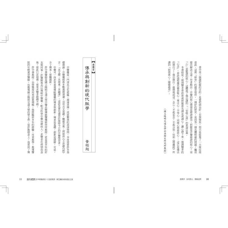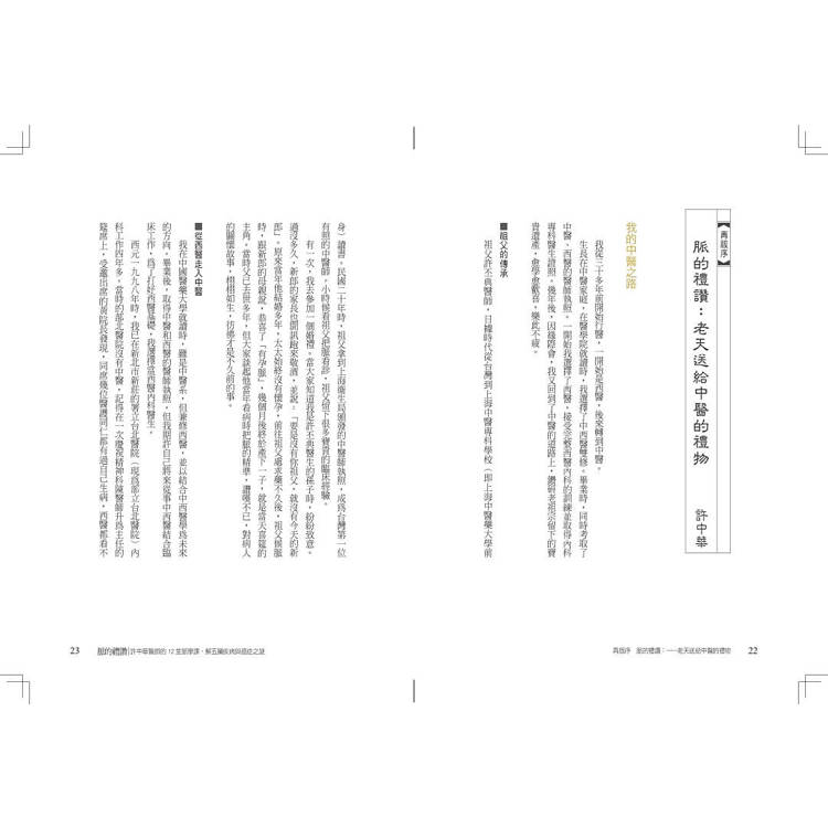 要完成一本書,真的很不容易,感謝這些年來許多人的協助,才有機會由課堂上的筆記、講義,再彙集成書,這裡要特別感謝,構思初期好友劉永毅與G女士之啟迪,郭子榕與詹益宗醫師細心安排,郭子榕、 李琪、詹益宗、林立涵、洪立偉、謝秉翰、曾薇蓁、沈蘊之、洪舒玨、蘇柏璇、瞿瑞瑩、楊佩鈺、張廷瑋、顏秋濱、高羿宸、賴博政等年輕醫師,從第一章到第十二章忠實錄音,並製作逐字稿,也要感謝許麗娟、沈蘊之醫師,不厭其煩校正,詹益宗醫師依我原意製作了「左右卅六脈位圖」,這是件辛苦的事,另外邱榮鵬醫師的錄影,王儷餘同學與黃鈺娟助理在文字編排與行政協助,也要一併感謝。最後曾育慧博士,以她專業的文字敏覺,還有康健出版團隊的協助,讓本書可以呈現更平實、平易近人的風貌。《脈的禮讚》再版也要特別感謝傳統醫藥研究所博士生李俊樸醫師,用心的校正與建議,還有天下康健優質的團隊協助,最後也要感謝,我的家人、栽培我的師長、可愛的病人。