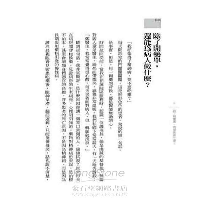 本書作者是專業精神科醫師,因為一桶瓦斯,而頭也不回地投入非藥物治療的研究。二十幾年的臨床經驗,親眼看見藥物帶來的痛苦,遠遠超過疾病本身。書中網羅國內外重要的研究數據、真實個案的生命故事,化為悲天憫人的感人文字,只希望表達一個信念:身心困擾並不是非藥不可,很多人,可以獲得比藥物更好的幫助。這本書就是提供大家相關的資訊,了解非藥物治療的可能性以及作法。