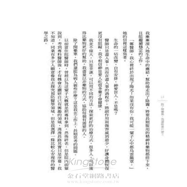 在她情緒最低潮的時候,流著淚走進我的診療室。她的痛苦、鬱悶,在幾十分鐘的訪談中通通傾倒出來,當時我只是一個很單純的想法:「我要幫助她!」經過一次次的深談,我漸漸深入她生命中的癥結,幫助她走出了陰霾,將要長期服用的精神科藥物都停下來,且能繼續穩定的工作。