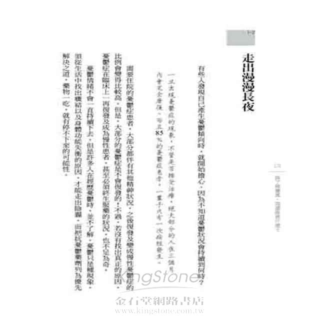 專業的醫師都知道,一旦出現憂鬱症的現象,大部分的病人只是長期服藥控制,很難痊癒。憂鬱只是個過程,須從生活中找出癥結,才能走出陰霾,而把抗憂鬱藥劑列為優先解決之道,藥物一吃,就停不下來。
