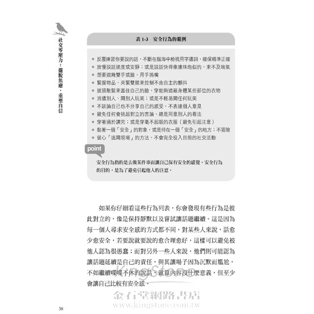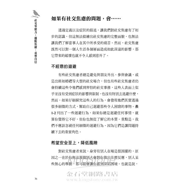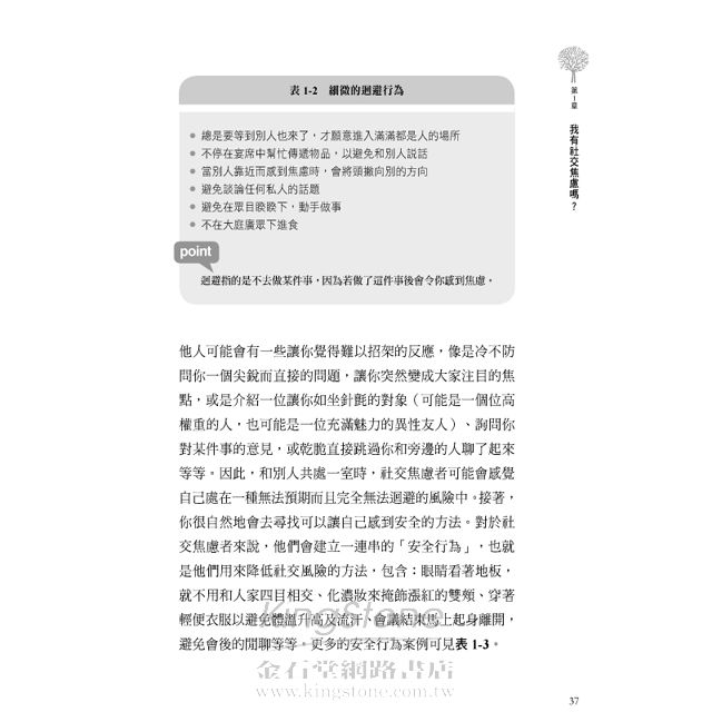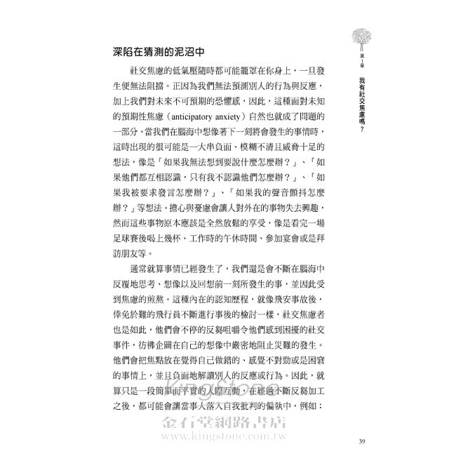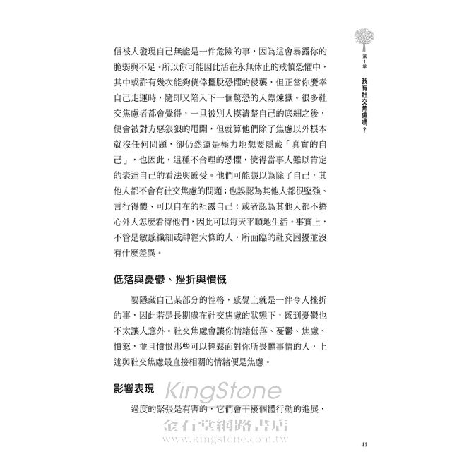 ◎第一部分解釋什麼是社交焦慮、害羞和社交焦慮有什麼不同、當社交焦慮發作時會是什麼樣子,以及這樣的問題究竟是從何而來,我們又應該如何看待這樣的情況。