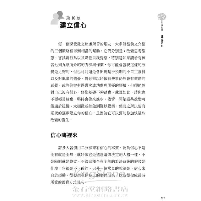 ◎第二部分用實際的例子帶你一步步辨認出自己的想法,改變行為,減少對自己的注意力,並且逐漸建立起信心。