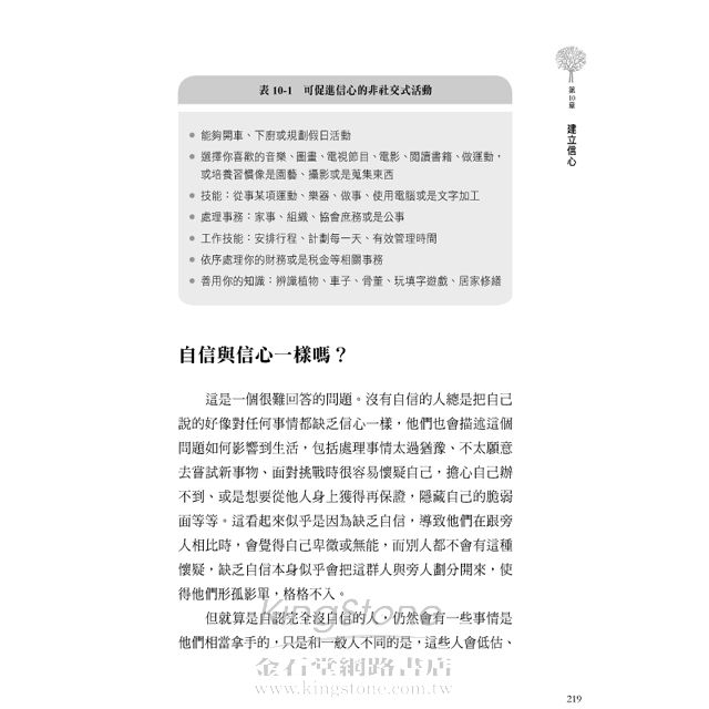 自在做自己/確認你的目標/隨時掌握進度/用自己的步調嘗試新事物/有效及無效的問題因應方式/規劃無壓力的活動:均衡的概念/對付孤單或寂寞的首要方法/務必牢記的心法/常見的Q&A