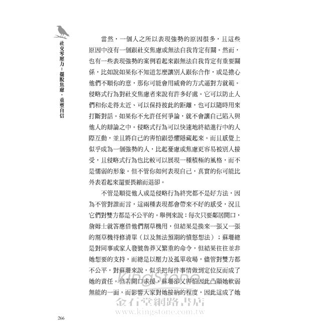 第三部分,則貼心地再補充其他選擇,包括:邁向自我肯定、被霸凌者的傷痕及放鬆訓練。這是修正社交焦慮認知習慣後的大補湯或是升級版,提醒讀者在生活中若更能訓練自己勇於說不,找出協商合作的成功機轉與敢於面對批評,走出過去扭轉被霸凌的陰影與處境,更能放鬆培養彈性的身心靈,掌握全書相信社交焦慮者將能有機會重新站上舞台,做回生活中的主角。本書除了適用於想要認識或有社交焦慮問題的讀者,也很適合實務工作者像是醫師、護士、臨床心理師或諮商心理師遇見類似個案,可以提供他們作為自助閱讀的好書。