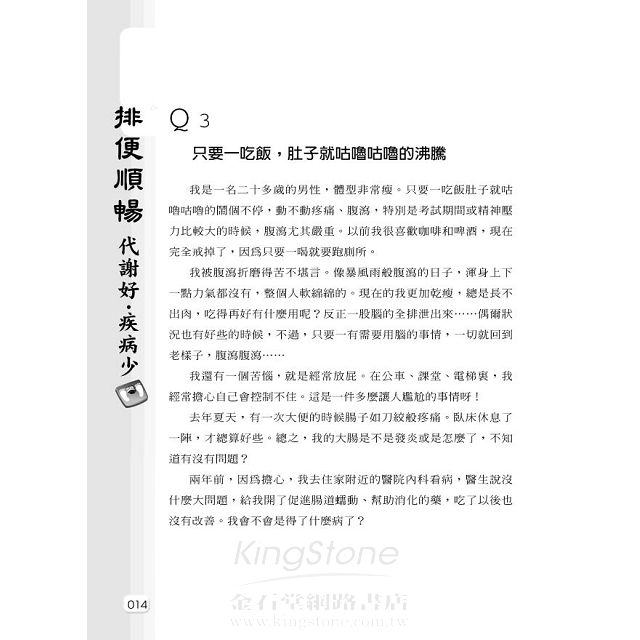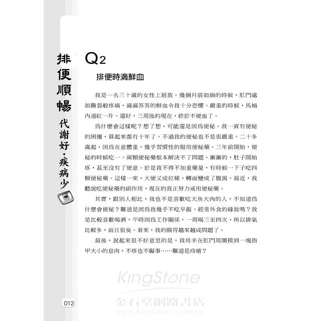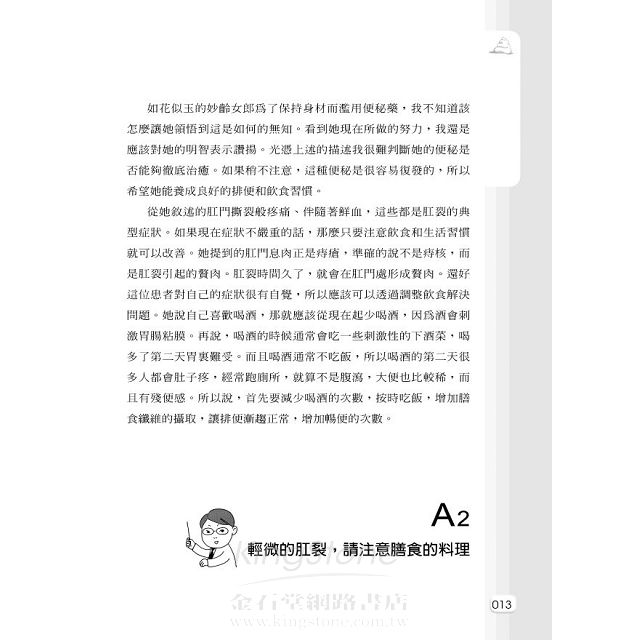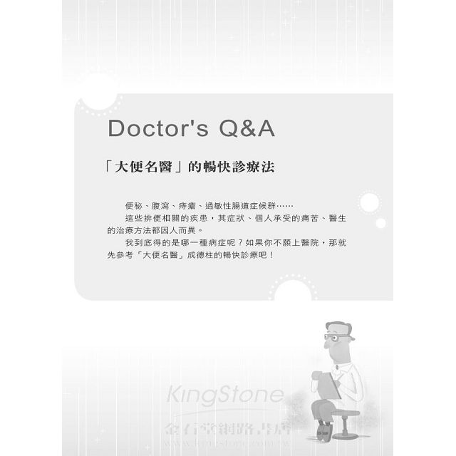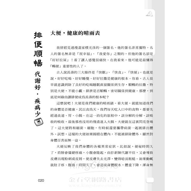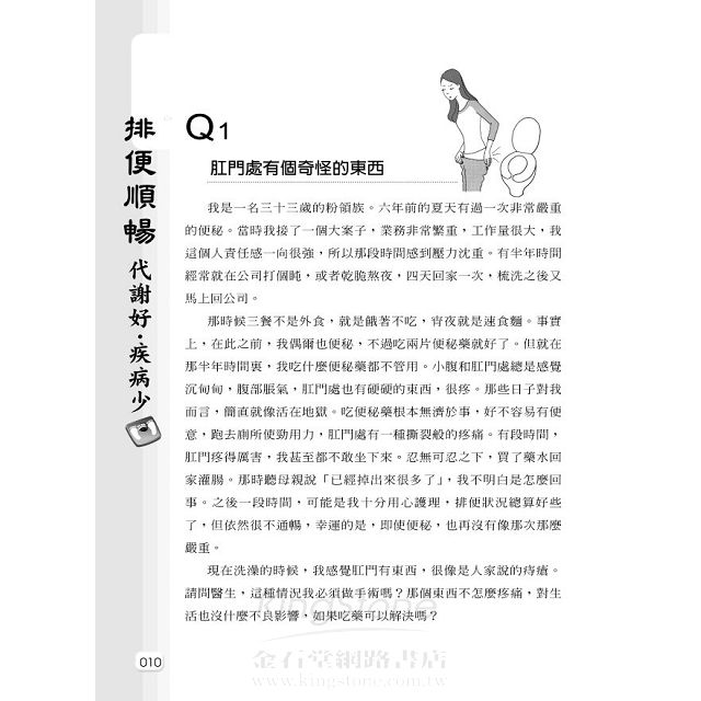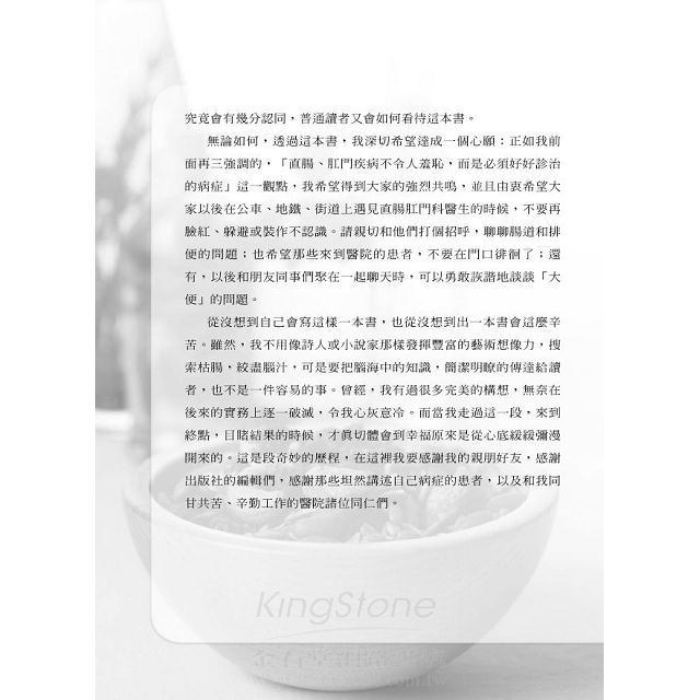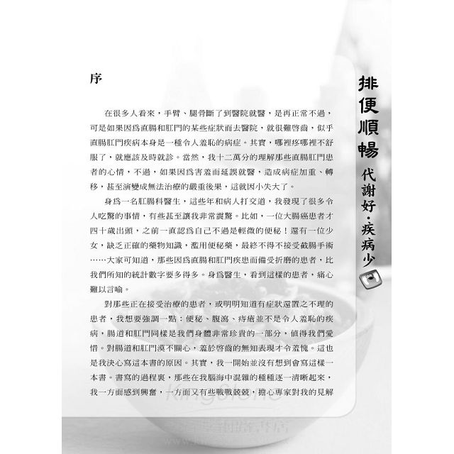 我想利用這本書鄭重的告誡讀者:便秘、腹瀉、痔瘡,並非是令人難以啓齒、感到羞恥難為情的疾病,腸道與肛門是身體內,極其重要的器官,值得多加珍惜和保護。