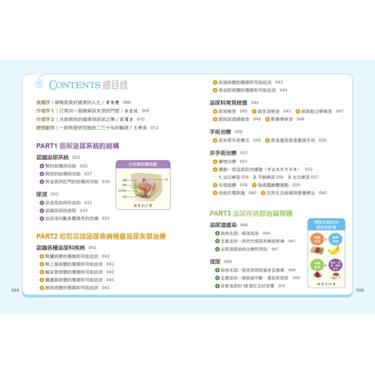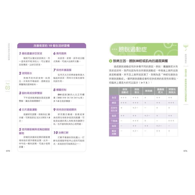 ☑飲食與生活保健指南:從蔓越莓到磁波刺激,從夜尿控制到骨盆底運動,打造泌尿健康的日常習慣。