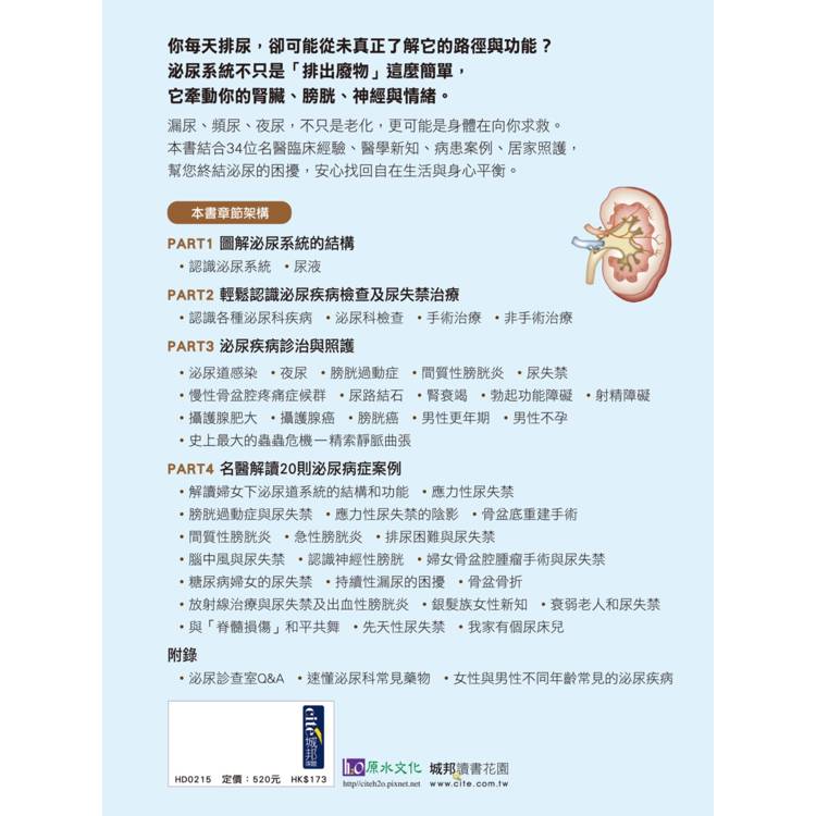 本書由台灣泌尿科權威醫師群共同撰寫,集結三十年臨床經驗與最新醫療知識,整合泌尿系統結構、疾病診治、手術與非手術療法、居家照護與衛教指引,打造最完整的泌尿健康百科,是醫療院所的門診衛教、社區推廣、長照機構、家庭照護最實用的泌尿健康工具書。