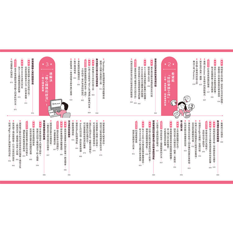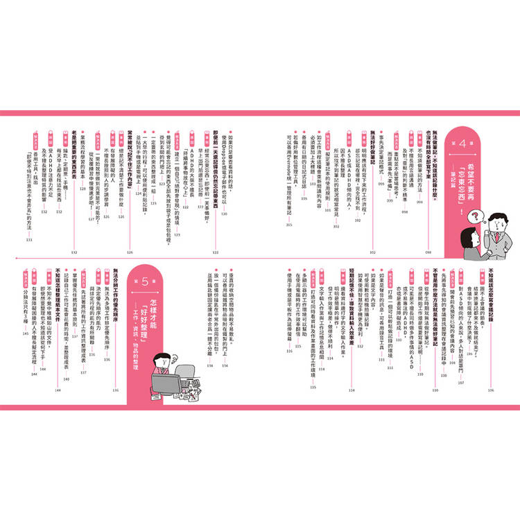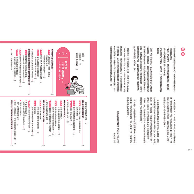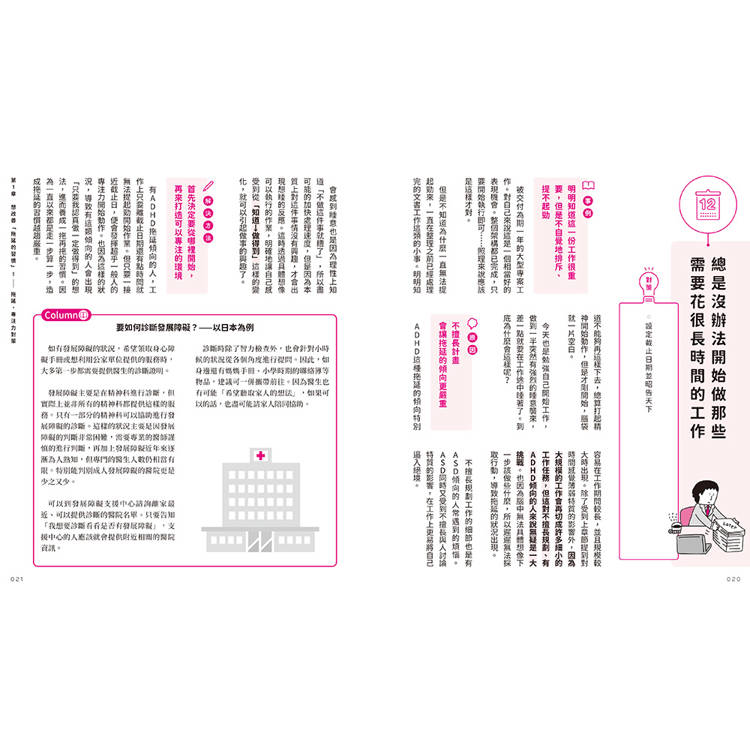 目前市面上可以看到不少本,清楚介紹ADHD(注意力不足過動症)或ASD(自閉症類群障礙)等發展障礙的書籍。深受這類困擾的人,不管是工作或是生活上的應對,多少可以從這類型的書籍中找相關的參考資訊或啟發,並讓自己在社會互動上更順遂一些。而本書便是聚焦在辦公室工作技巧的其中一本。