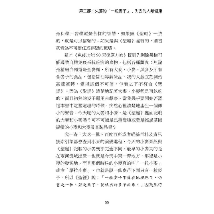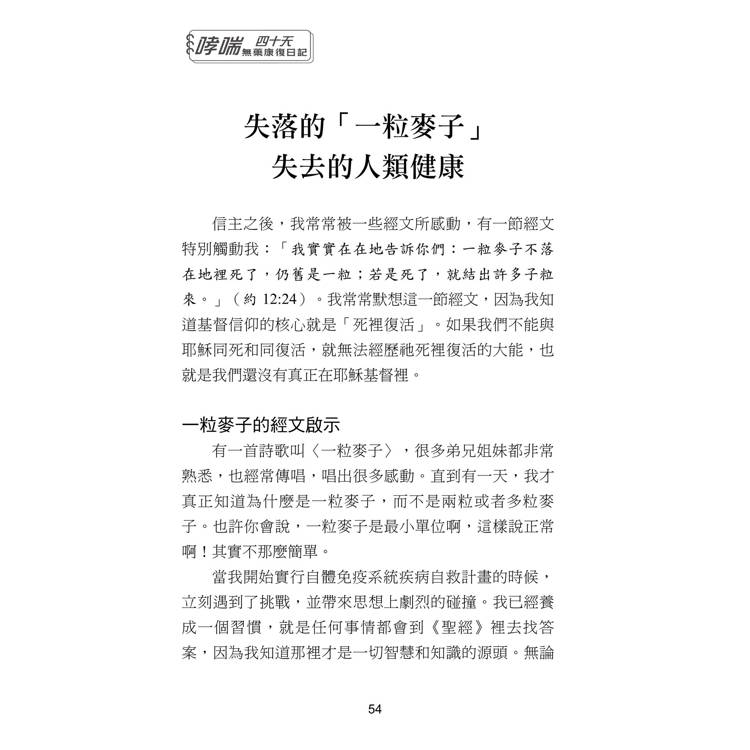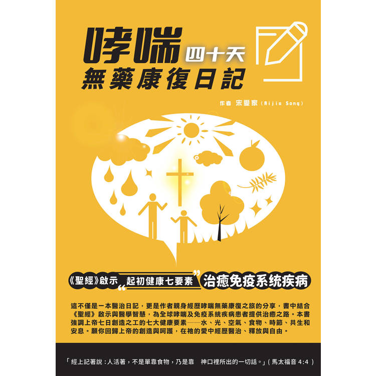 這不僅是一本醫治日記,更是作者親身經歷哮喘無藥康復之旅的分享,書中結合《聖經》啟示與醫學智慧,為全球哮喘及免疫系統疾病患者提供治癒之路。本書强調上帝七日創造之工的七大健康要素──水、光、空氣、食物、時節、共生和安息。願你回歸上帝的創造與呵護,在祂的愛中經歷醫治、釋放與自由。