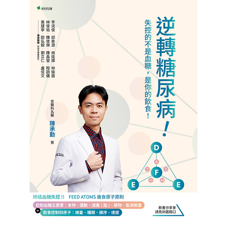 家醫科名醫陳承勤醫師行醫近20年的生涯中,深刻體悟需要有周全性血糖控制策略!有鑑於此,獨創出一整套完美融合醫學實證策略及行為科學實踐步驟:「FEED ATOMS進食原子原則」,這套逆轉糖尿病科學飲食法是經由台灣醫學權威《內科學誌》期刊認證的控糖策略,有助於血糖達標並維持長期血糖穩定,減緩胰島細胞衰退,提升治療成效,並降低併發症風險。