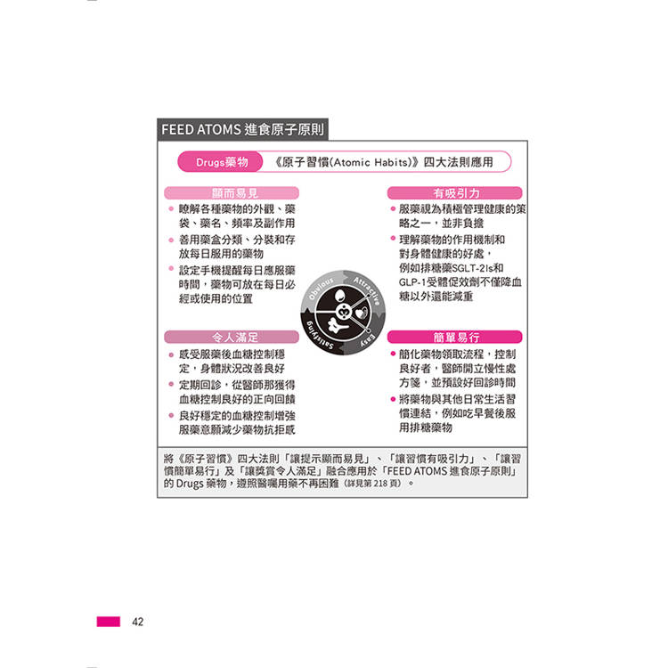 其中飲食控制的四個原子「ATOMS」分別是餐食的總量、種類、順序及進食速度(Amount, Type, Order of Meals and eating Speed),共同組成英文縮寫為:「FEED ATOMS 進食原子原則」。此英文版著作已取得美國圖文著作權。