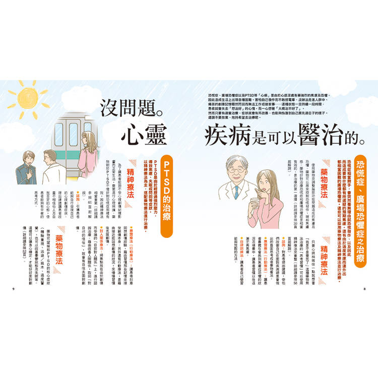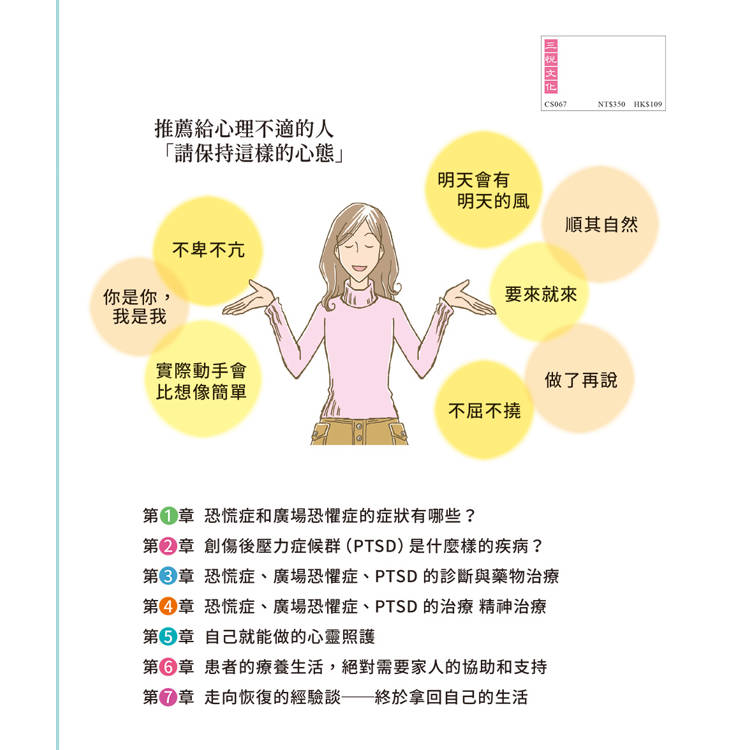 這本書就是你最實用的自救手冊。沒有艱澀的理論,只有直接的問題分析與行動方案。本書快速解析恐慌症、廣場恐懼症和PTSD的核心問題,並提供具體的應對步驟,包括:發作當下如何緩解、如何逐步克服逃避行為、以及如何處理創傷記憶。內容搭配豐富的插圖與簡潔的文字整理,是一本容易閱讀又兼具實用性的身心保健指南。