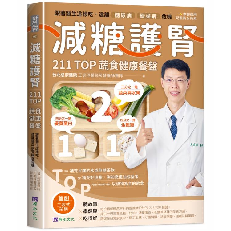《減糖護腎211 TOP蔬食健康餐盤》一書涵蓋全面的健康理念, 包含「減糖、好油、好蛋白」、「喝水、低鹽、低磷鉀」、「植物、降酸、好腸道」以及「運動、正念、好助人」等四大面向,並結合211 TOP 餐盤,將艱澀的醫學概念化為日常可行的生活指引。書籍中穿插門診中的真實故事,將病人遭遇的困境與改善過程娓娓道來, 讓這本書不是冷冰冰的理論,而是帶有溫度、能引發共鳴的醫病智慧。
