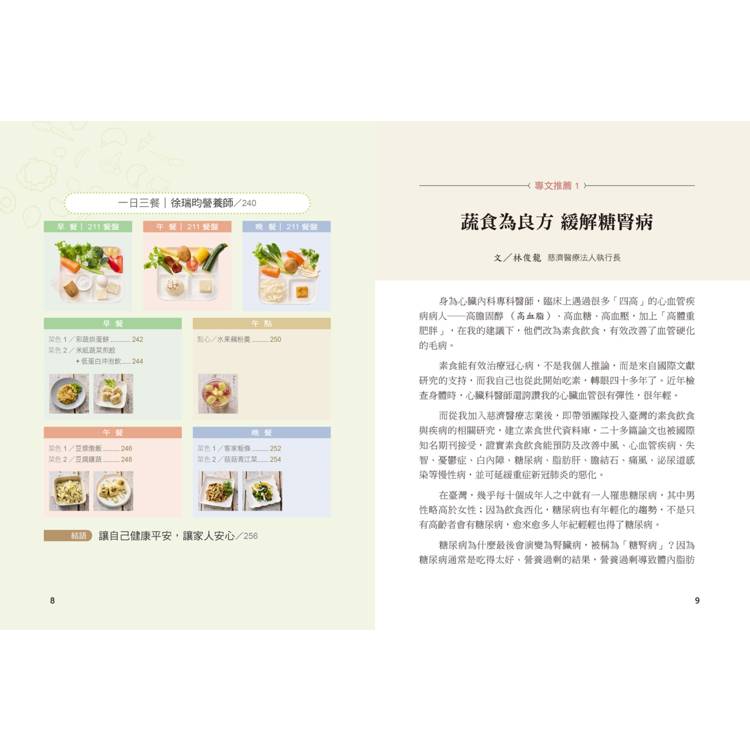 「王醫師以自身多年茹素的體驗,運用圖片故事的口吻,讓健康飲食變得可理解、可實踐,願你在這本書裡找到與自己健康重新對話的方式。」——彭清秀醫師(台北慈濟醫院教學部副主任、台北慈濟醫院腎臟內科)