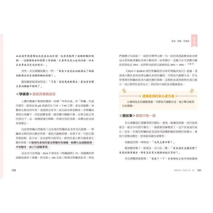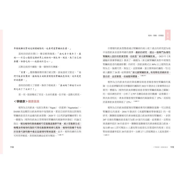 此書不只除了引用國際文獻指引,也參用台北慈濟醫院腎臟科多年來在蔬食與腎臟健康領域的研究發現,在此基礎上,王醫師更與台北慈濟醫院的營養科合作,設計出兼具美味與實用的食譜,帶給讀者健康蔬食的理念,把臨床經驗與專業知識,透過生動小說與具體可行的操作方法整理成書,讓病友與一般讀者能輕鬆理解,付諸實踐。