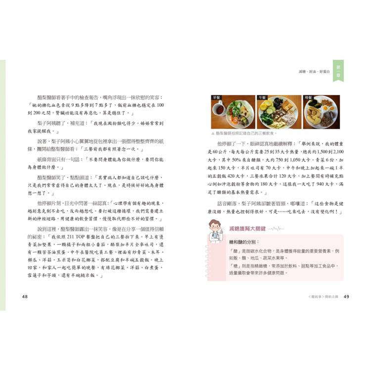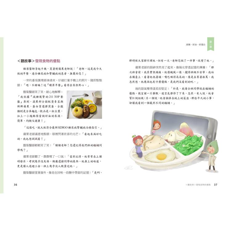 全書以深入淺出的案例分享,圖文並茂,說故事方式述說糖尿病慢性腎臟病的飲食知識,不浮誇,不八股,不沉重, 讀來輕鬆寫意,容易上手。——陳靖博教授 (高雄長庚紀念醫院教授級顧問醫師)